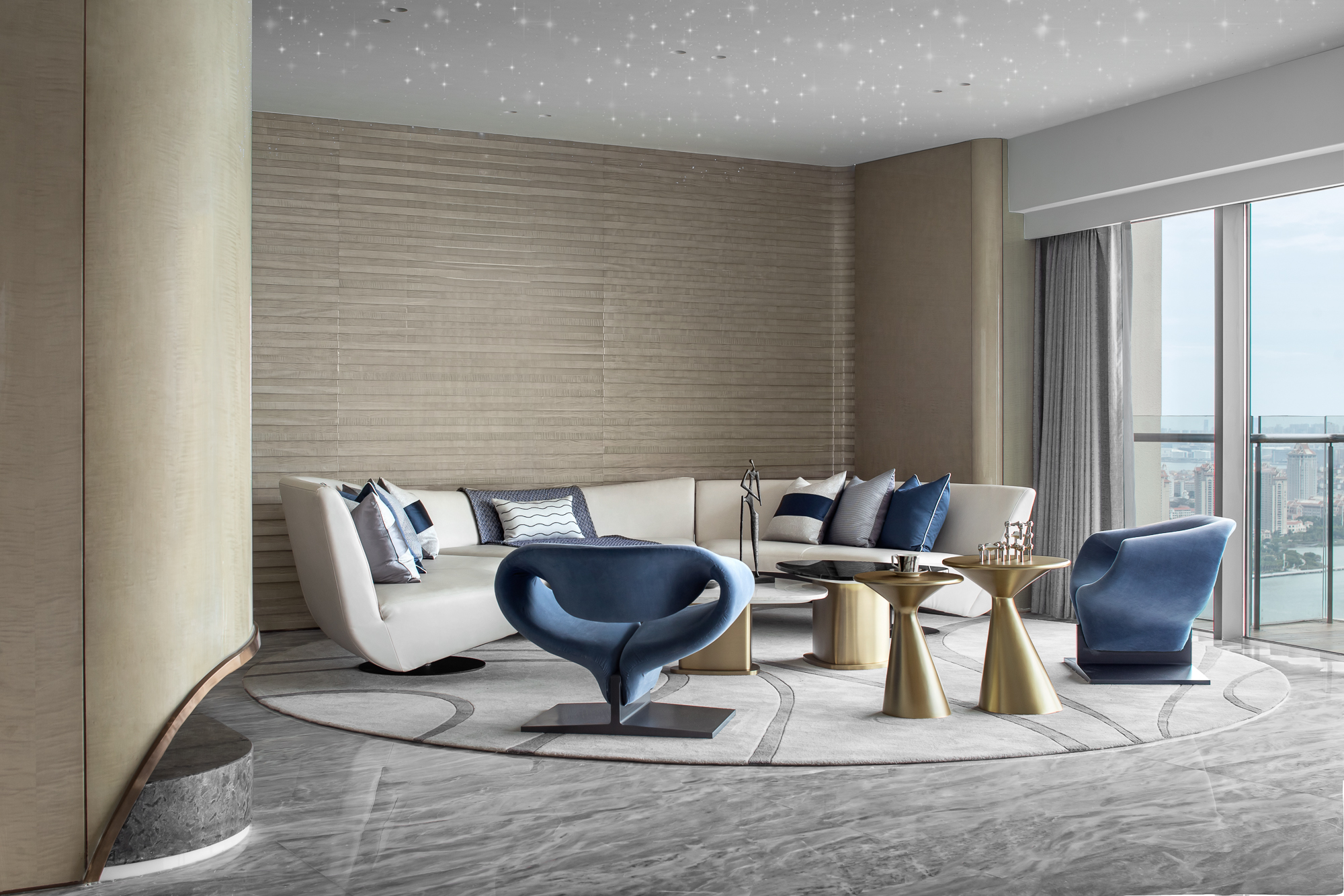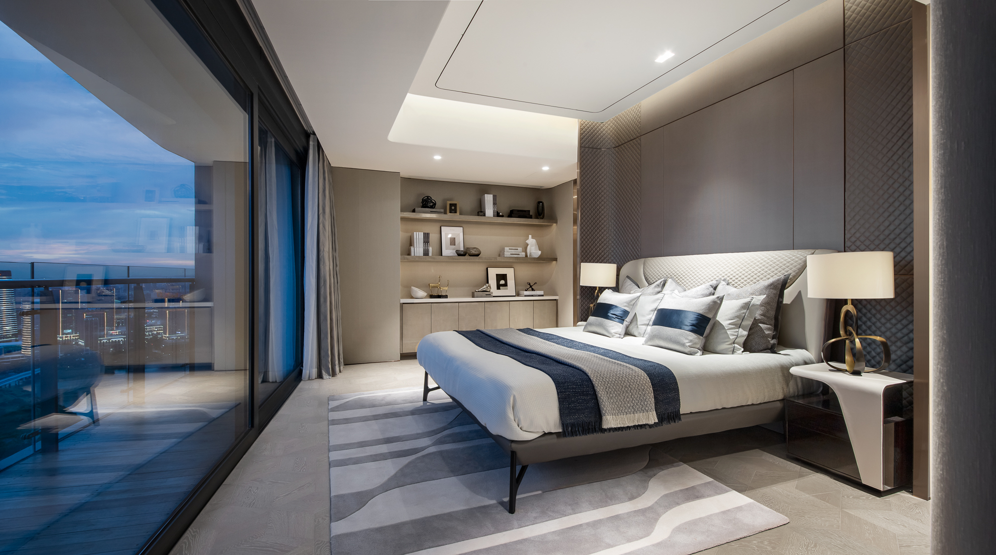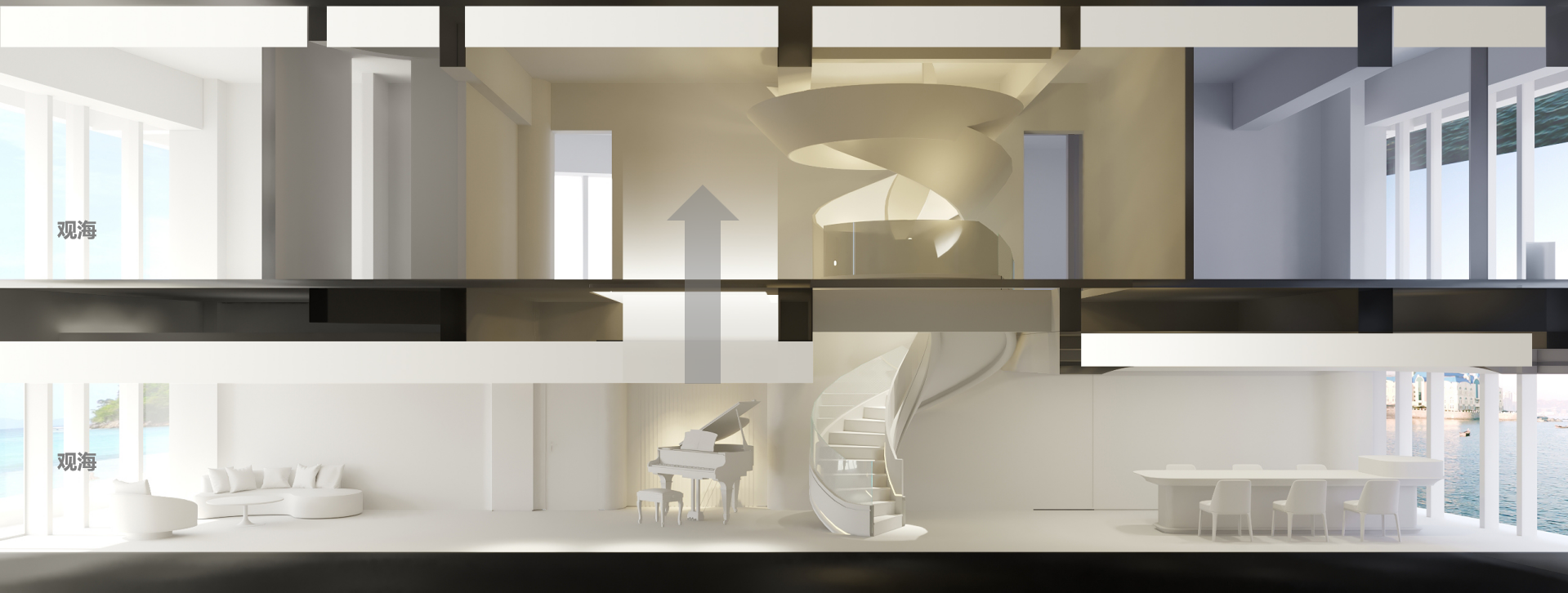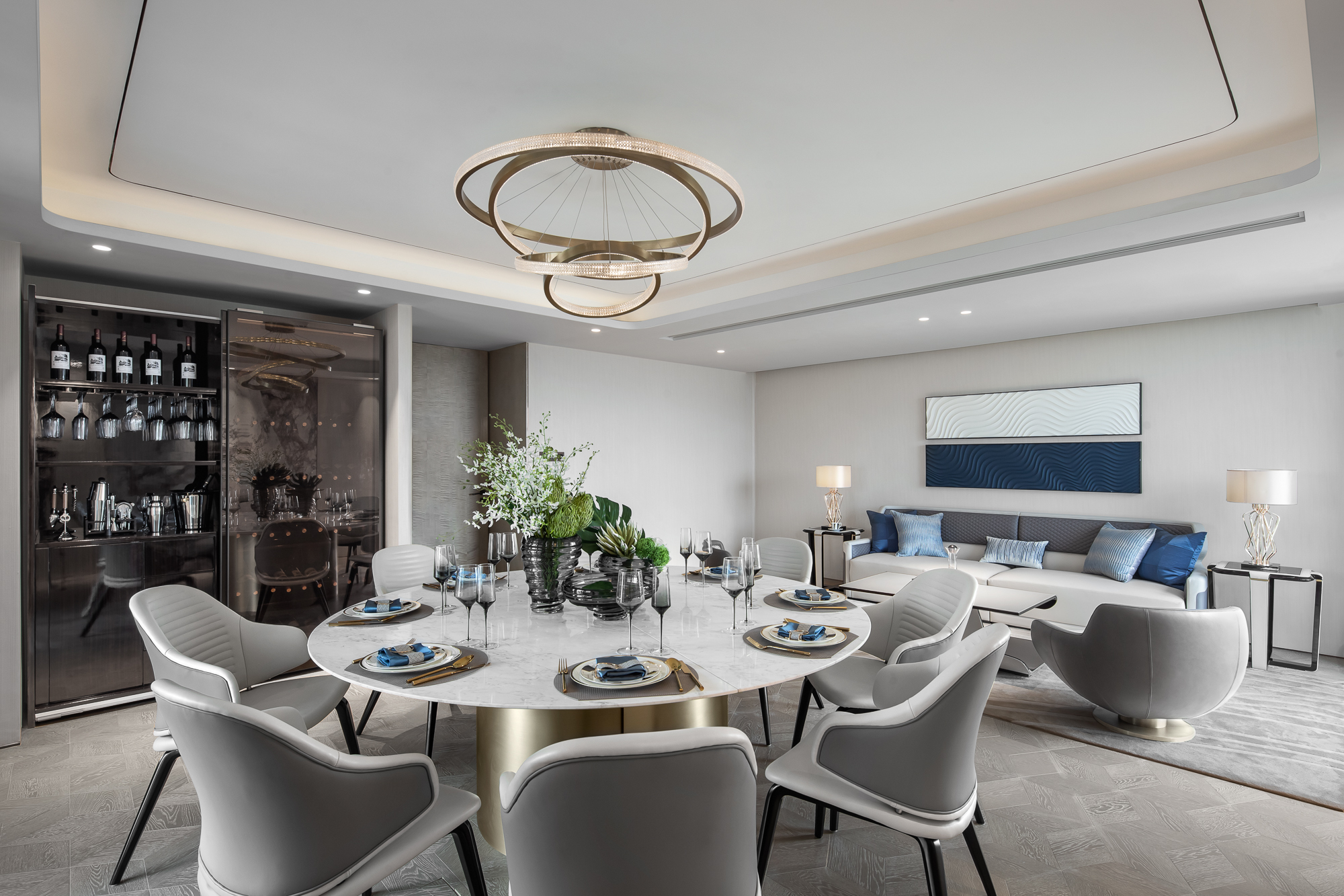 以游艇+私人飞机理念引至室内设计概念,充分表达现代天际豪宅的全新生活理念,低奢的优雅居所为主调,满足一家七口功能,兼顾社交属性,彰显主人品味。 电影宽幕视野观赏到海洋的开阔感,转变为拥有双面宽海景天际会客厅及天际主卧会客与居住空间交叉,在生活起居社交中尽享天际奢华。