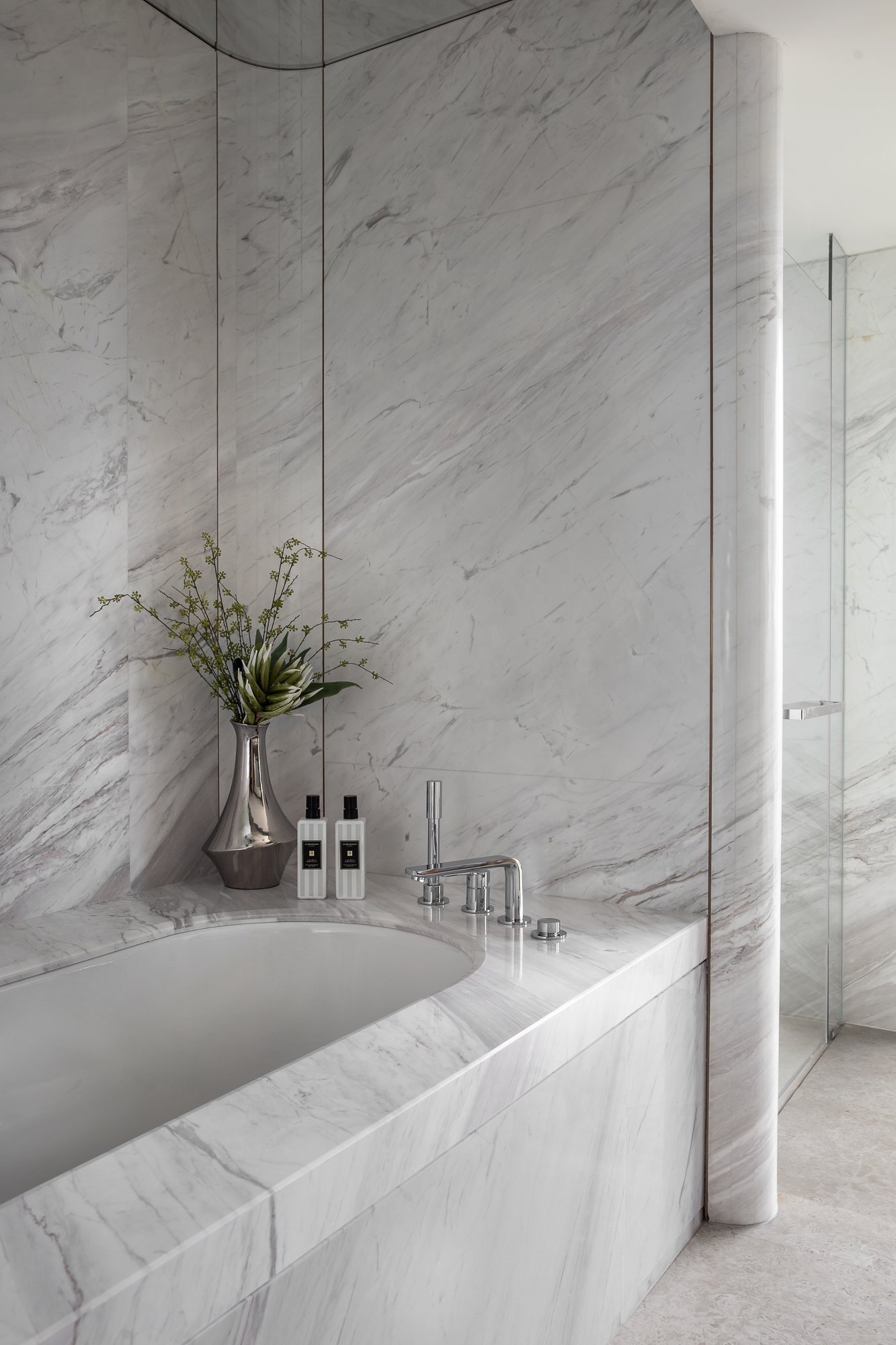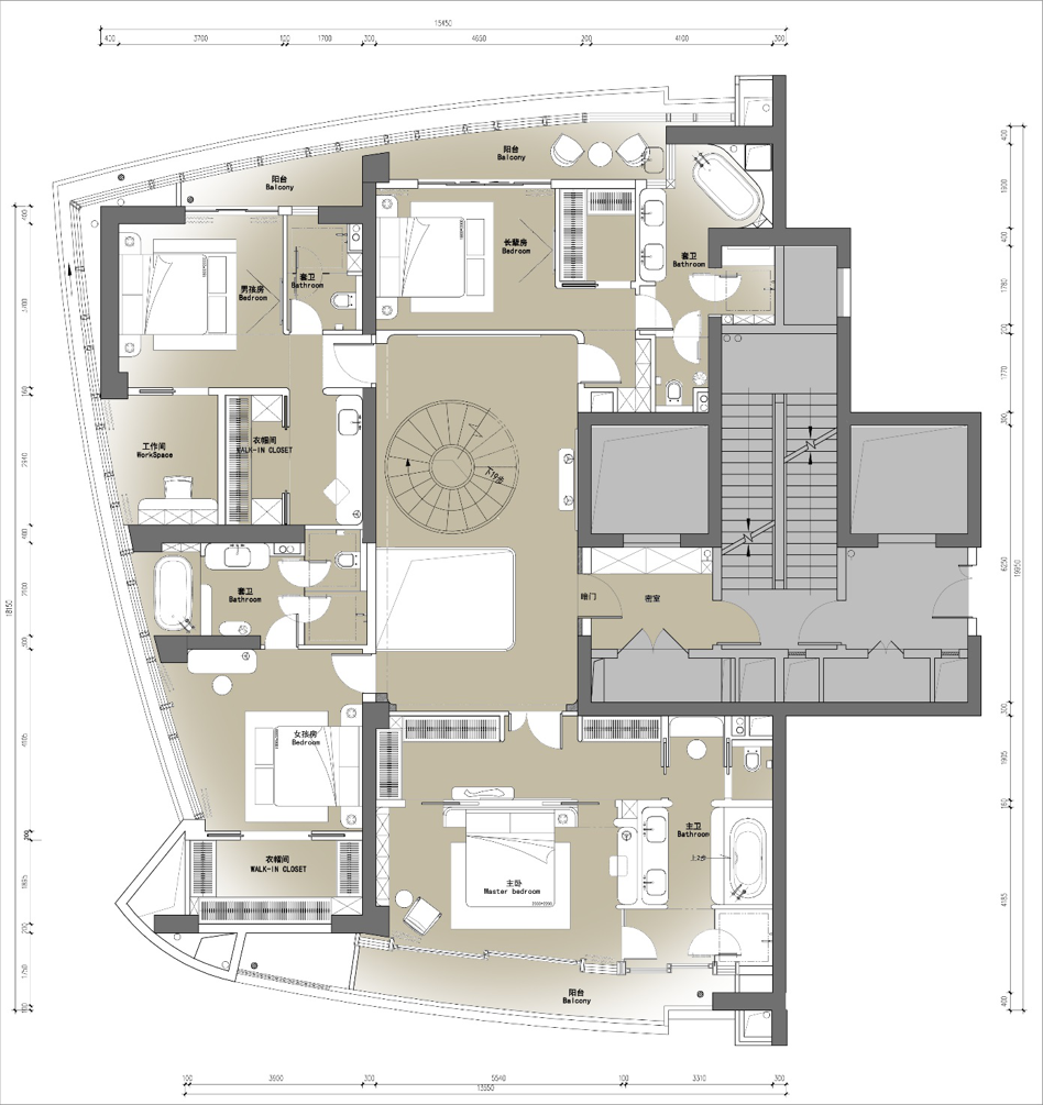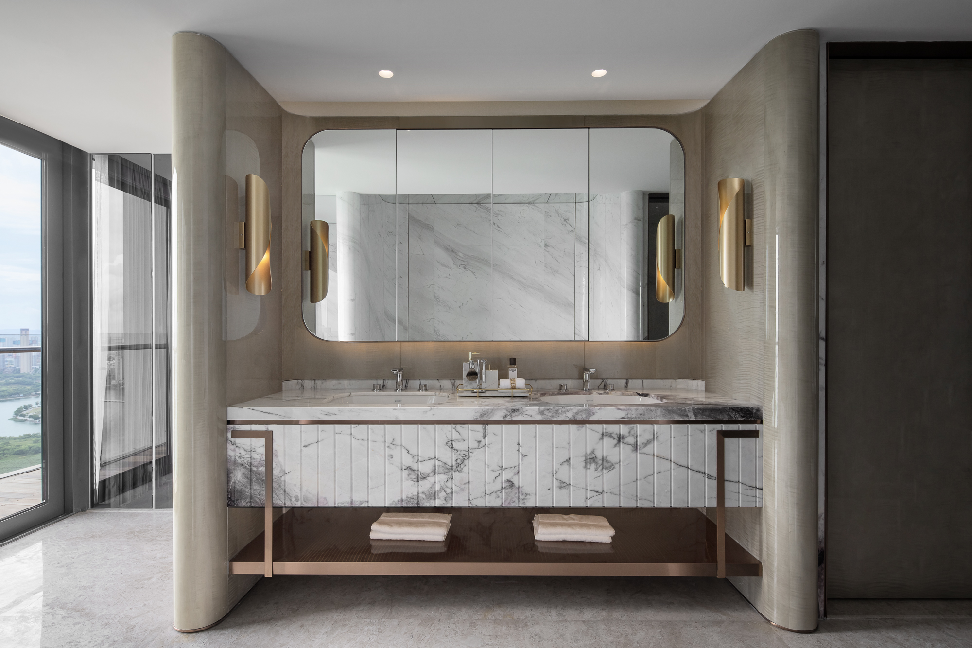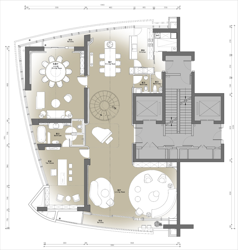 以游艇+私人飞机理念引至室内设计概念,充分表达现代天际豪宅的全新生活理念,低奢的优雅居所为主调,满足一家七口功能,兼顾社交属性,彰显主人品味。 电影宽幕视野观赏到海洋的开阔感,转变为拥有双面宽海景天际会客厅及天际主卧会客与居住空间交叉,在生活起居社交中尽享天际奢华。