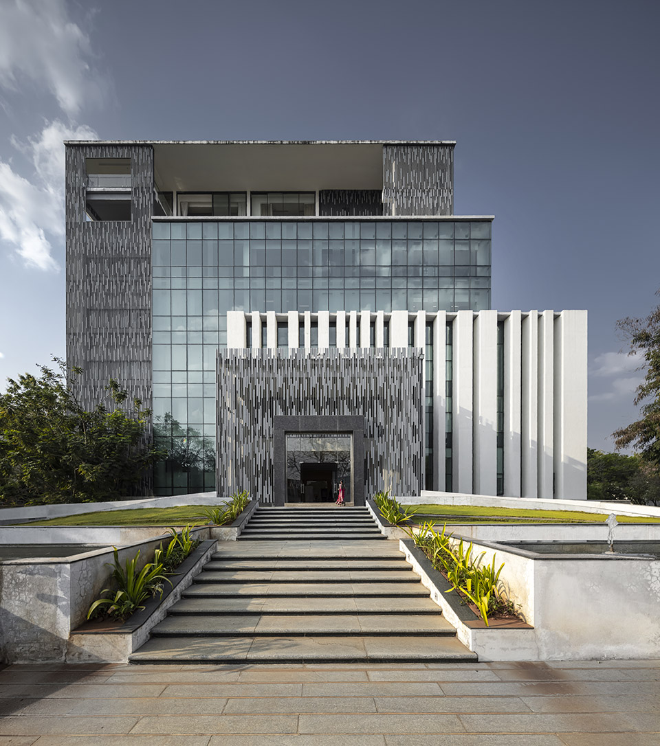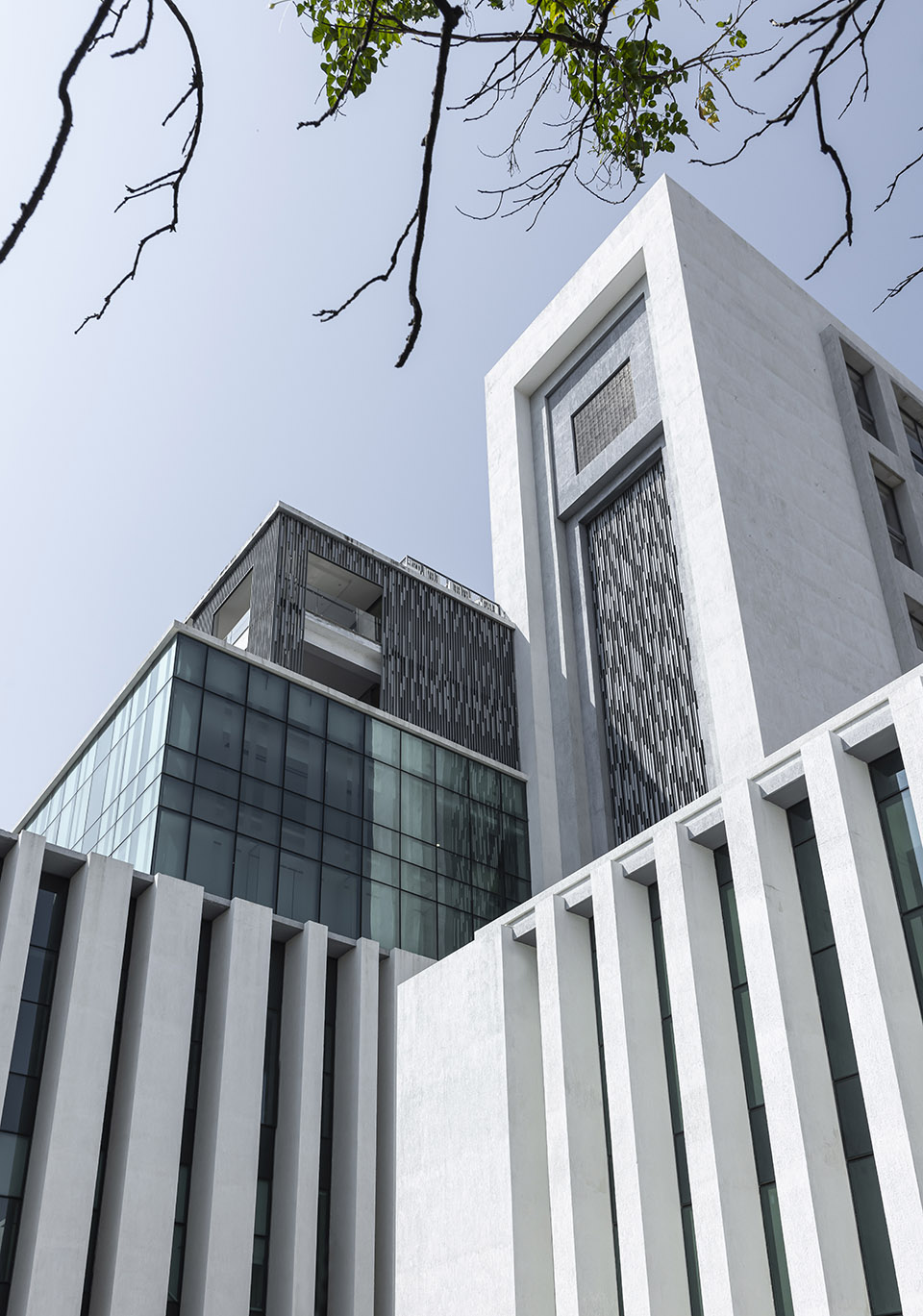 Both buildings are defined by the 4 prominent horizontal bands with varying massing and materials, which create an illusion of multiple buildings. The play of scale and material creates a hierarchy which is differentiated by the usage of different materials at each level such as MS Jali, Masonry boxing, DGU Sliding and DGU Structural glazing. This showcases the concept of “Stepping Blocks to the Future”, emphasising a forward-looking design philosophy that integrates diverse materials to symbolise advancement and evolution in architectural principles.