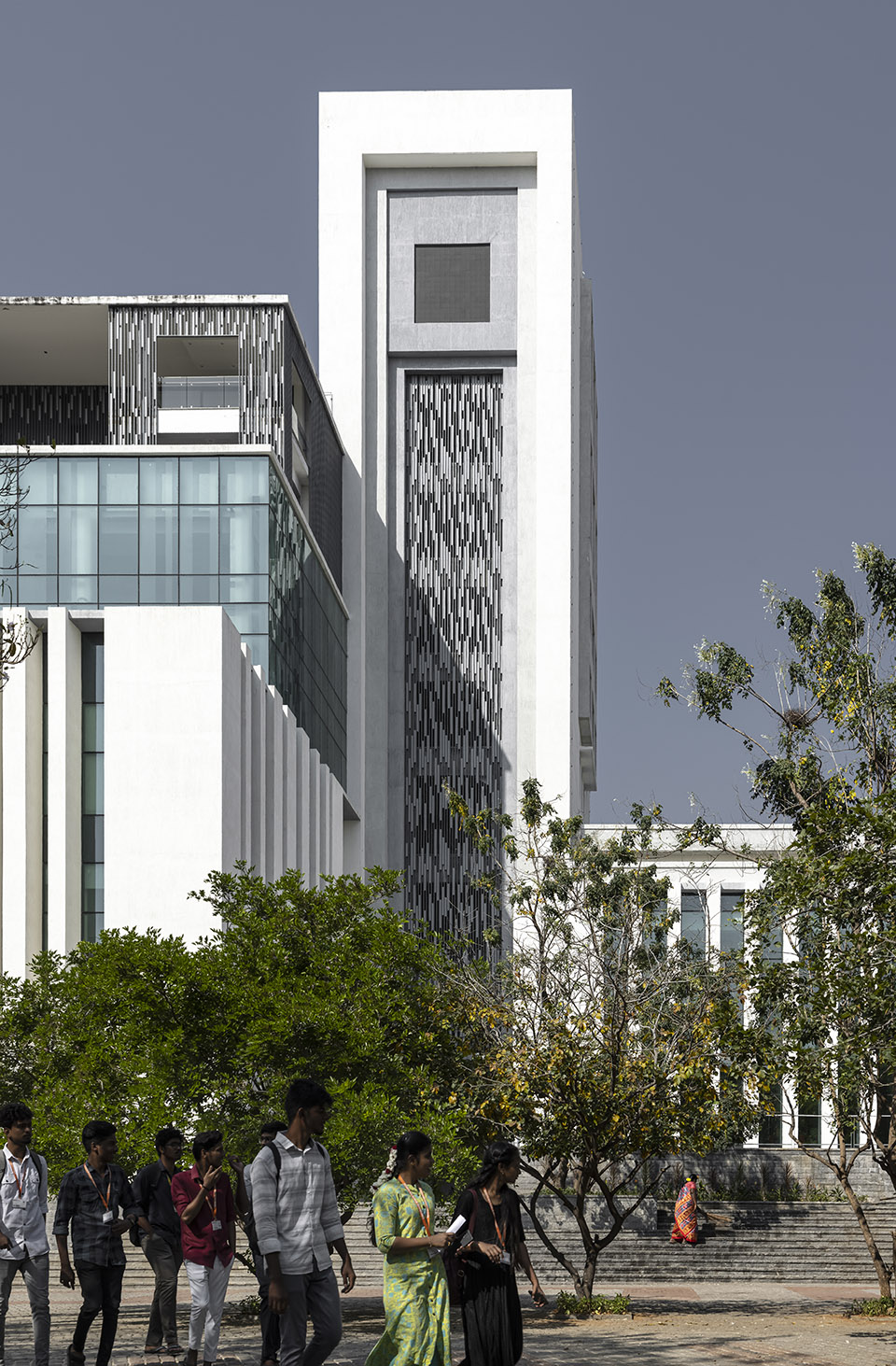 Established in 1993, the Sona College of Technology campus has grown into a hub of educational excellence in Salem, the “Steel City” of Tamil Nadu, fostering a dynamic learning environment for growth and innovation amidst the city’s industrial backdrop. Initially catering to a thousand students, the institute’s rapid growth has called for continuous expansion, and the adaptable masterplan has continuously evolved to accommodate a flourishing student body that now numbers over 8,000. This growth mirrors the aspirations of the people of Salem and surrounding areas for upward mobility and diverse educational opportunities. IMK has been associated with the project since its inception, and the recent additions to this continuously growing hub are the Sona College’s Admin and Library Block. These have been collectively designed as modern landmarks symbolising the college’s commitment to progress. Designed as “Stepping Blocks to the Future”, the two buildings stand as a beacon of architectural innovation in Salem. The distinct facade of the Library Block is the new face of the Sona College of Technology. It has been conceptualised as a symbol of progression, and the building features a stepped facade with striking designs and materials, culminating in a clock tower offering panoramic views of the city.