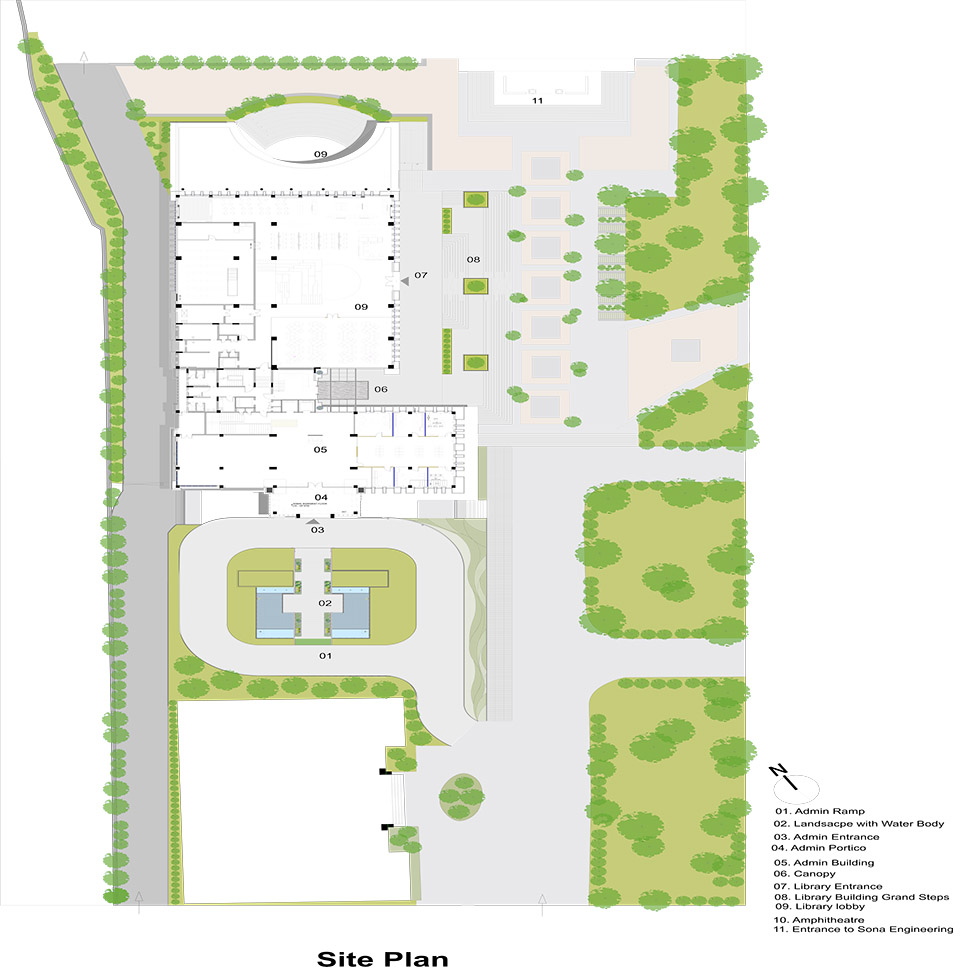 Located on the front lawns near the Main Engineering Block, popularly known as the Heritage Block, as it was the first building to come up in 1993, the Admin & Library Block was to be the tallest building on the campus. The building needed not to dominate the vista along the axis. Its size was modulated very carefully, and the building was stepped backwards to be in harmony with the rest of the campus while maintaining its landmark status as the tallest building in Salem. The building was accentuated by creating the rustic granite steps, which elevate the Admin & Library Block and also serve as an urban plaza. The Sona College’s Admin and Library Block houses administrative offices, placement departments, corporate floors, conference rooms, a banquet hall, management residences, a 1000-seater auditorium, and a state-of-the-art tech-friendly library.
