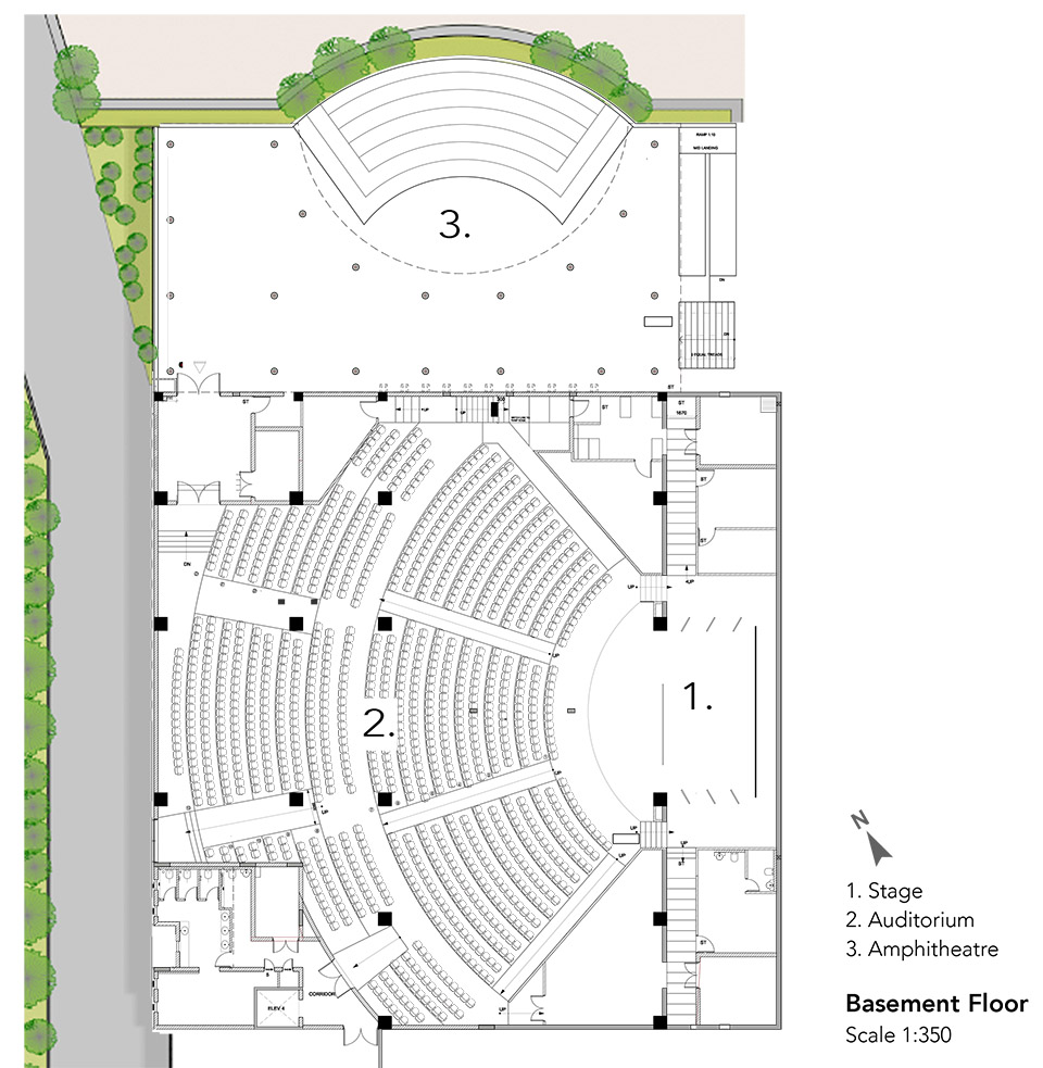 图书馆的功能不仅限于传统的阅读空间,还充分体现了以学生为中心的设计理念。在图书馆入口下方,增设了一座1000座位的礼堂。虽然这一功能最初并未计划,但随着学院需求的变化,设计中灵活加入了这一功能。此外,礼堂旁还有一个露天剧场和咖啡厅,供学生休闲、放松并互动交流。