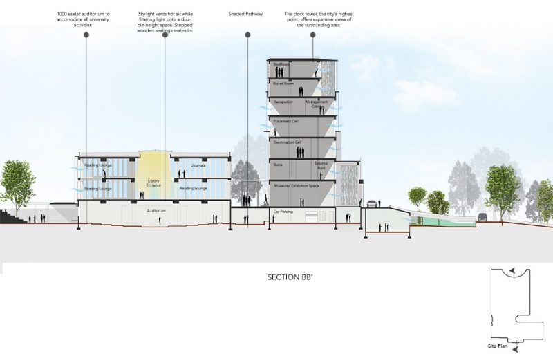 Upon approaching the campus, visitors encounter the expansive public space in front of the Library Block. This just becomes the recent most ‘hangout spot’ and interaction zone for students as the plan, quite literally, takes a step back so as to not overshadow the Heritage Block and its unobstructed vista, which serves as a pivotal connection to all other buildings on campus. The rustic granite steps leading to the library connect the building to the rest of the campus and act as an outdoor plaza. These steps take into consideration the existing trees and have evolved around them. The trees have been preserved, and they accentuate the entry to the library.