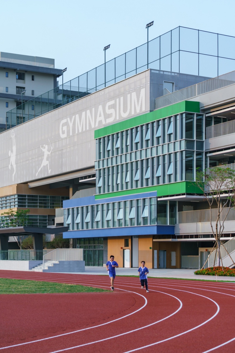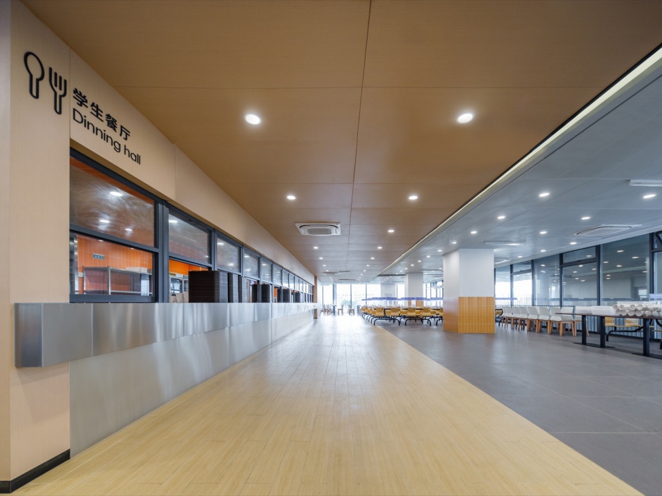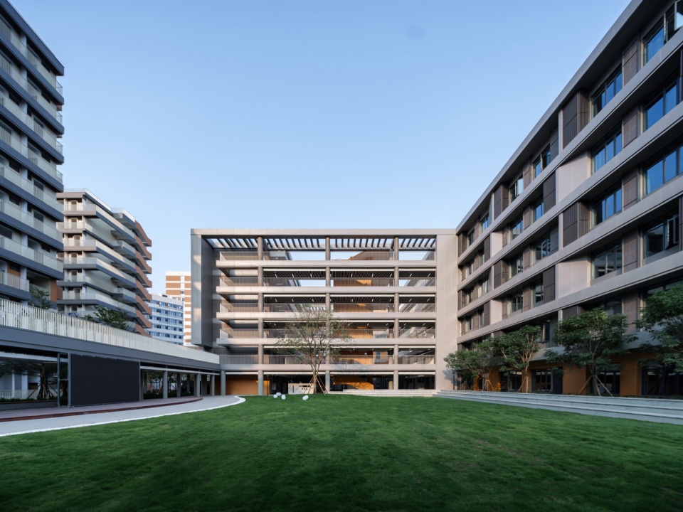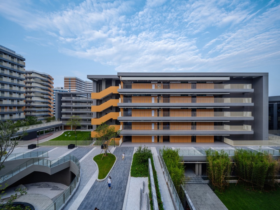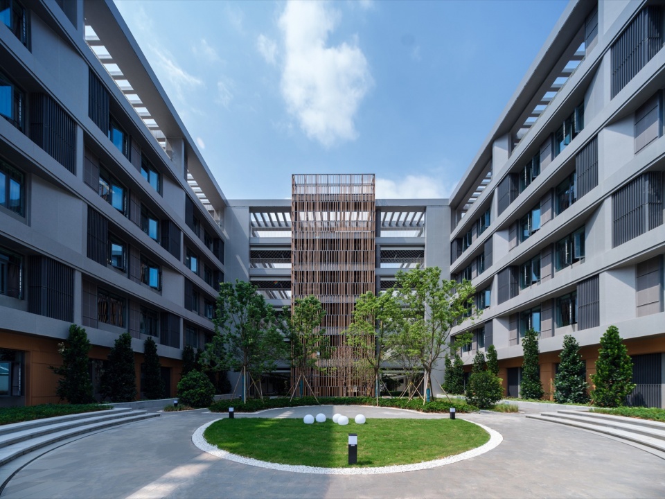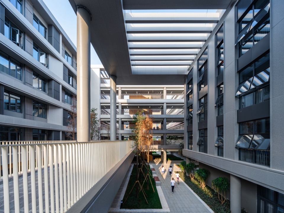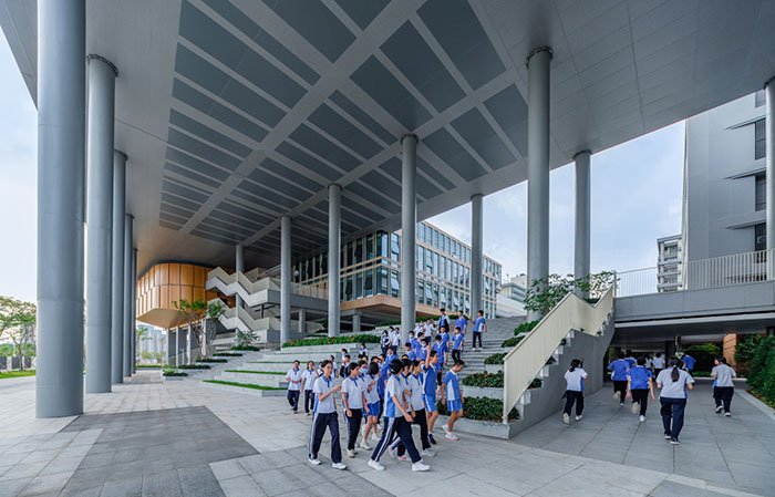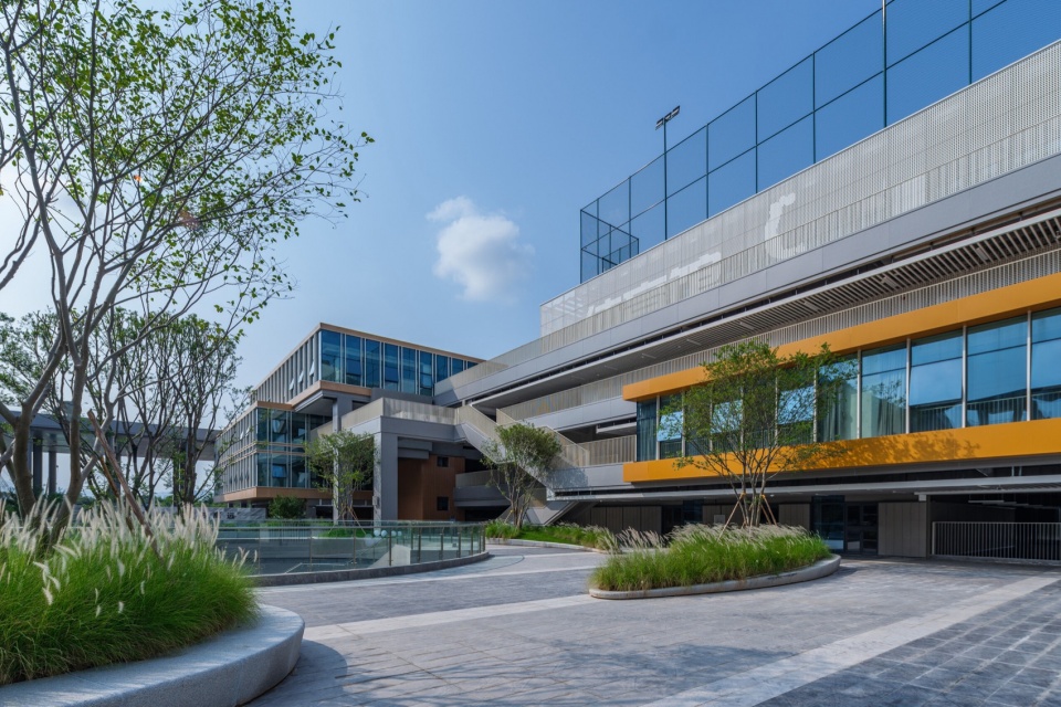 The overall façade of the school building is made of grey aluminum panels, accented by ceramic panels and perforated panels, with a simple color scheme that creates a vibrant, dynamic, and comfortable campus atmosphere and creates a “distinctive school city”.