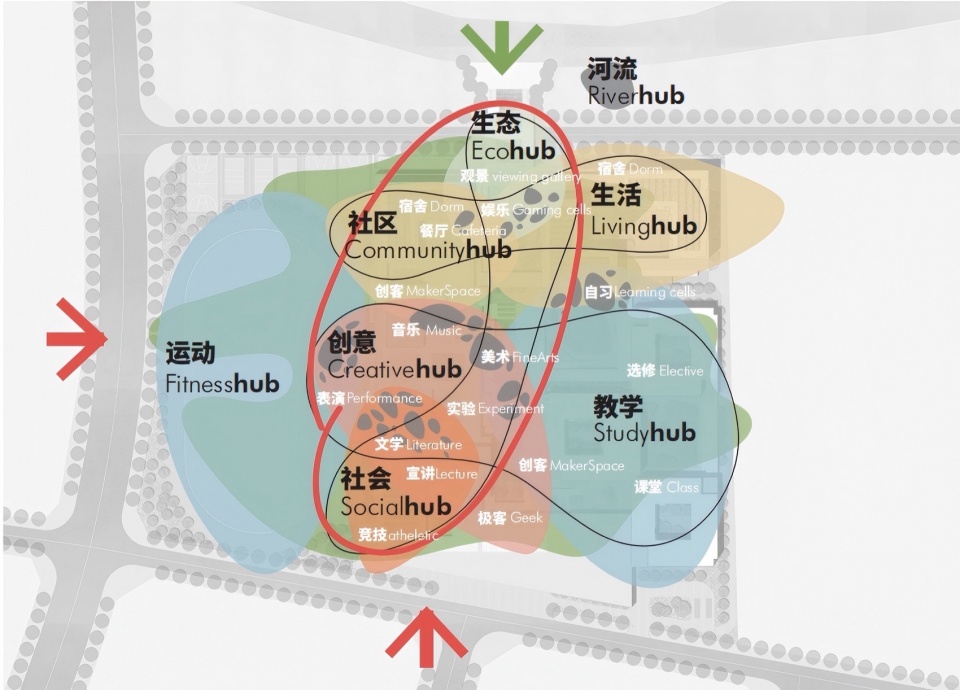 创造“校城”的社会生态系统,具备社区完善性、社会渗透性、空间多维性、城市标志性。