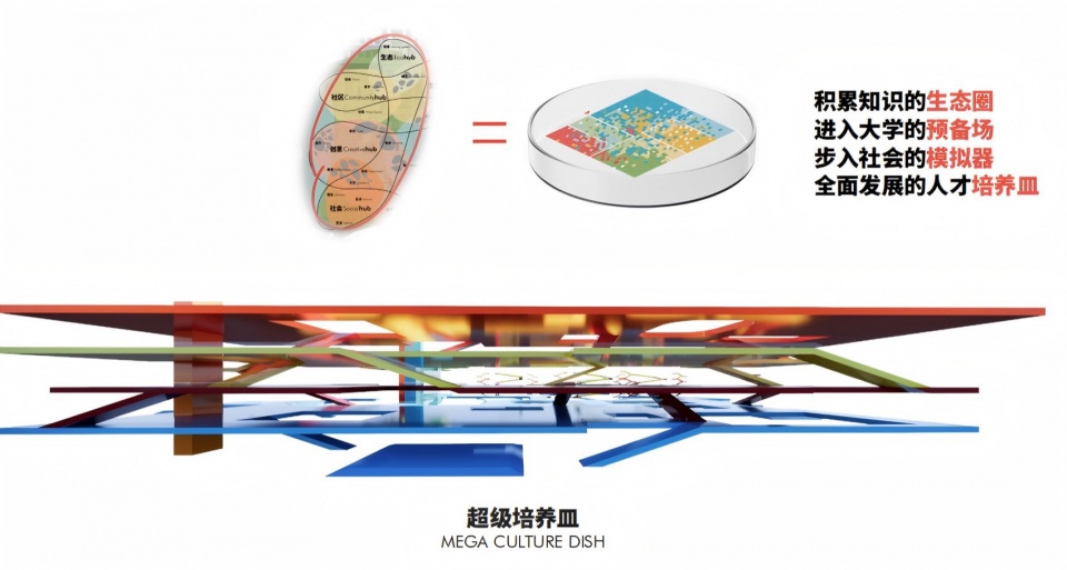 学校是一个复杂的自适应系统,如同精妙的自然生态系统,其内在逻辑规律和外在形态与其所处的大环境背景会产生一系列的动态关系。针对新时代和新的教育背景,项目在这个非传统的学校适宜的地段,创建一座非传统的,满足新型教育模式、培养新兴社会人才的“全域”校园。构想了一个充满活力的“校城”生态系统,意在打造一所“全面发展的未来学校”。