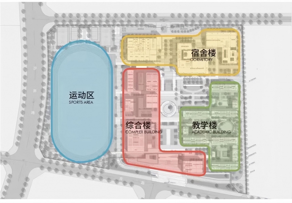 The project as a whole echoes north and south, making the north and south entrances of the school a central axis, combining the landscape and the external river to form a basic pattern, and planning the structure of the school into four districts, three axes, and twelve spaces with different functions, constituting a series of spaces for outdoor activities.