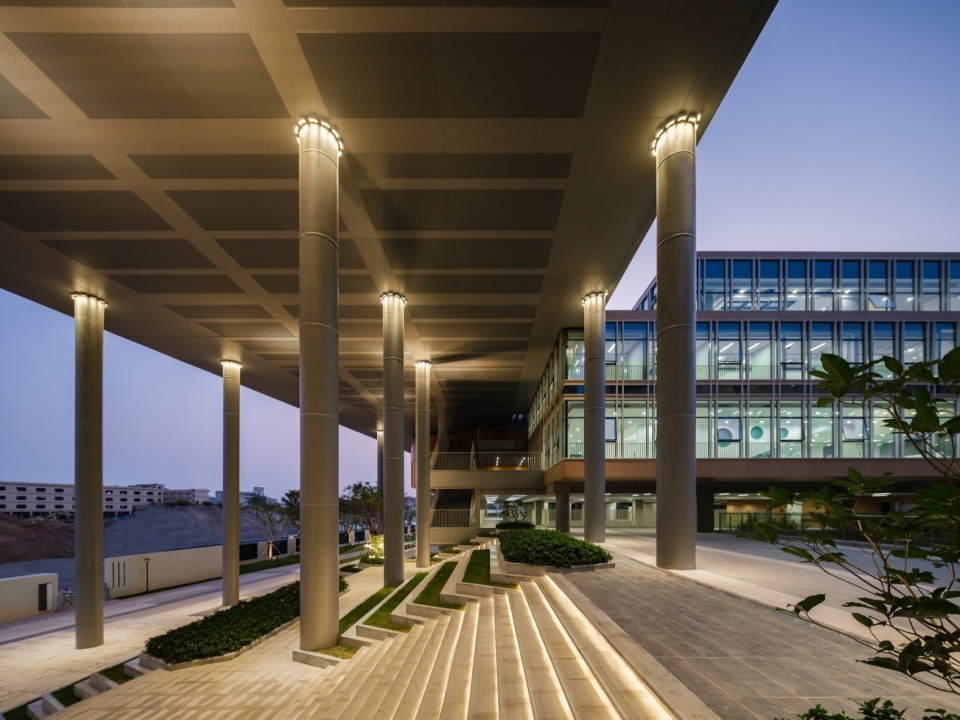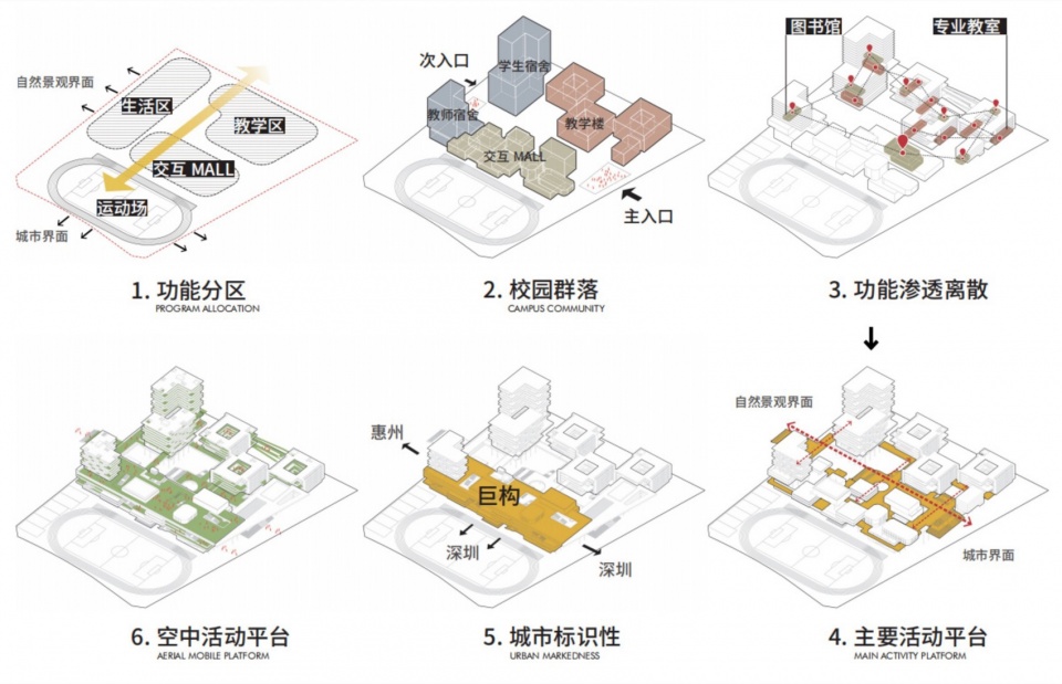 入口处的巨型顶层飘板连接两侧的教学楼与综合楼,形成两个区域的自然过渡。放大尺度的平台创造师生汇合集散的场所。入口广场的地面层和架空层延伸开来,同时连接综合楼、教学楼、宿舍楼等主要建筑群落,两个层面之间由多个楼梯相连。