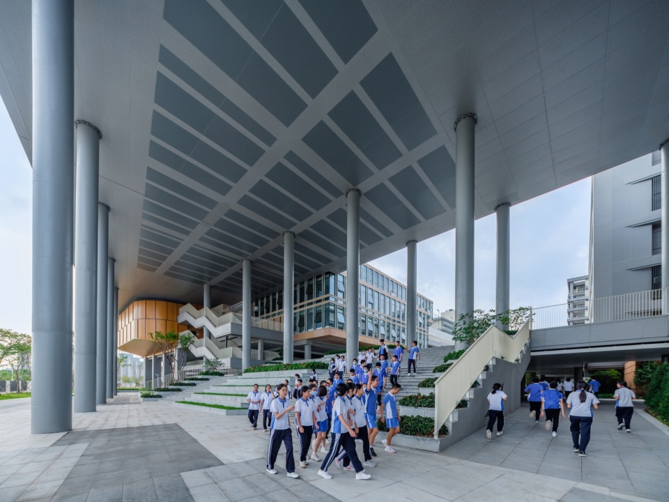 双层设计使得校园内部在水平和垂直面上四通八达,纵横交错,各个功能区紧密连接,为师生提供了多样的活动和交通空间。平台下方的架空区成为第二通道,整个空间的设计层次丰富,虚实结合,同时走廊下灰空间为师生创造了多样的活动空间。