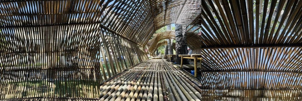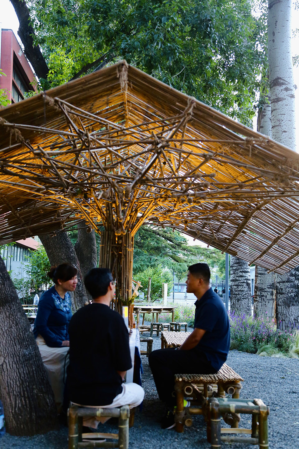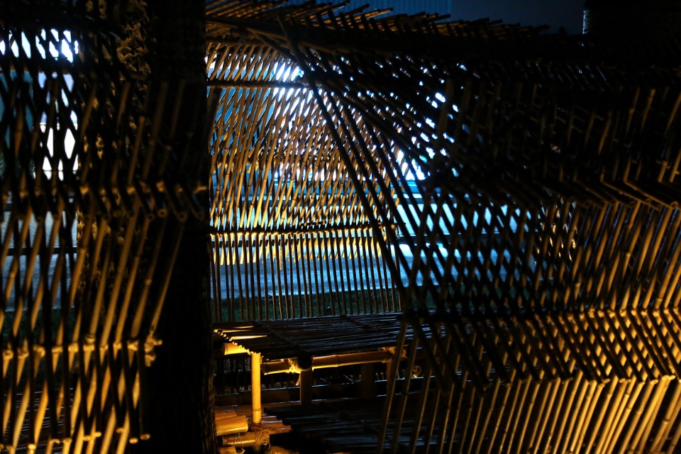 Opposite the main tea event venue, Harmony Café, stands four towering poplars. Utilizing this natural backdrop, the design team created the Light-Chasing Tea House to enhance the venue’s character. Bamboo poles of varying thicknesses were assembled using traditional Chinese wooden arch bridge techniques. Thick poles formed the structural base for pathways and seating, while thinner poles provided shading and table surfaces. The structure’s overall shape evoked the iconic black-awning boats of Jiangnan water towns, becoming a signature artistic element of the venue.