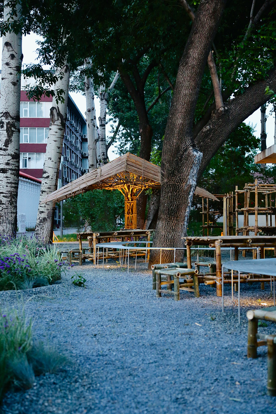 一期营造选点学院西门附近,包括一个花园和中心园林一角的竹林。设计营造秉持低造价、低技术的原则,突出手作,降低施工门槛,学院工会的50多名老师以高涨的热情参与到设计和营造过程。
