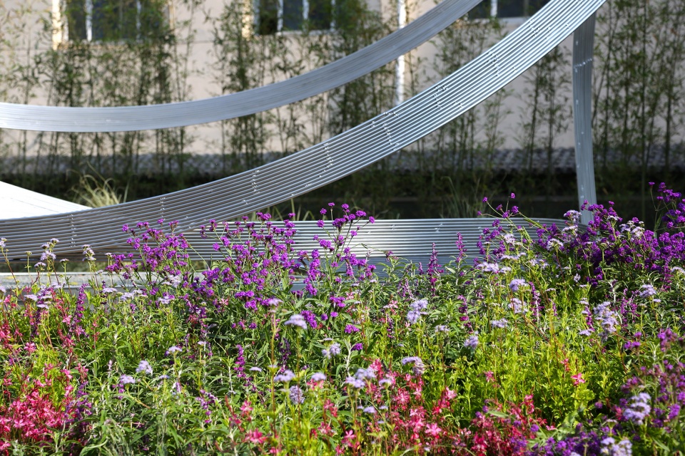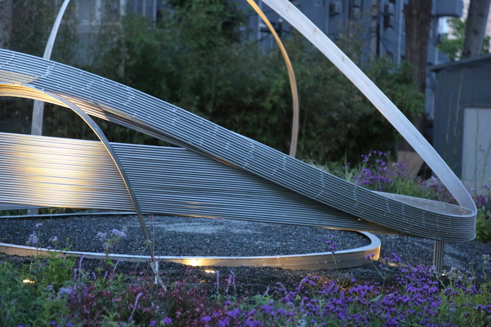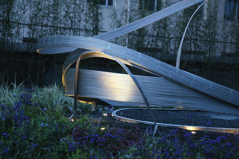 曲水流觞的对面一片空白用地,施工时挖出的土方堆土成为微小的坡地,此地块可定位为小型花园。与学院老师交流,此处因空地常作为学院活动场地,遂在坡顶的处增加舞台的功能,设计一人小剧场,既成为舞台,也可做剧场,同时兼顾可供休憩的座椅。花园整体栽植乡土野草,成为剧场自然的基底。设计师和工会50多名老师一起创作施工,将钢筋作为线条,在立体三维的空间中直接创作,成果像拆盲盒,有充满惊喜的期待值。最后小小的花瓣剧场成型,几组排线相互依托,将力学和美完美合一。