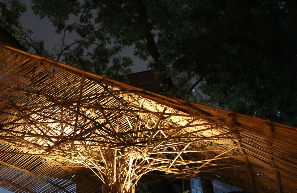 茶亭营造过程,正好赶上今年国际茶日活动,学院老师建议为国际茶日设计营造两个临时性茶空间。遂用竹为材,一来便宜,二来可较快实现,且竹与茶长物之志相融,实属相宜。设计使用最简单的绑扎方式降低施工门槛,让老师们充分参与施工。在曲水流觞的一侧,受江南油纸伞启发,创作充满诗意的撑花茶亭。方案从一根1.8米长的竹竿开始,不断支撑延展,最后形成了一个伞状的亭子,每一根竹子都是结构力学与美学的结合。