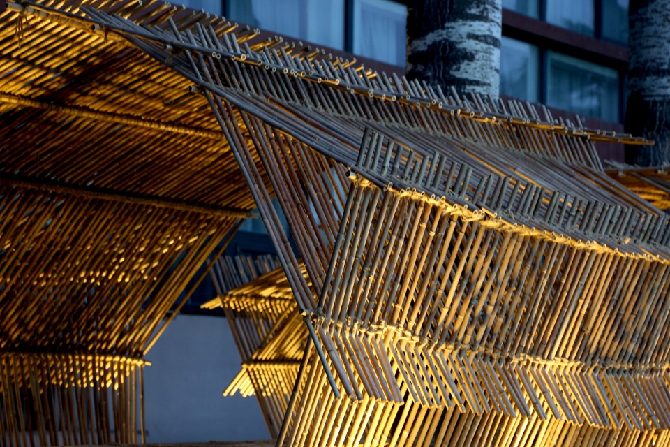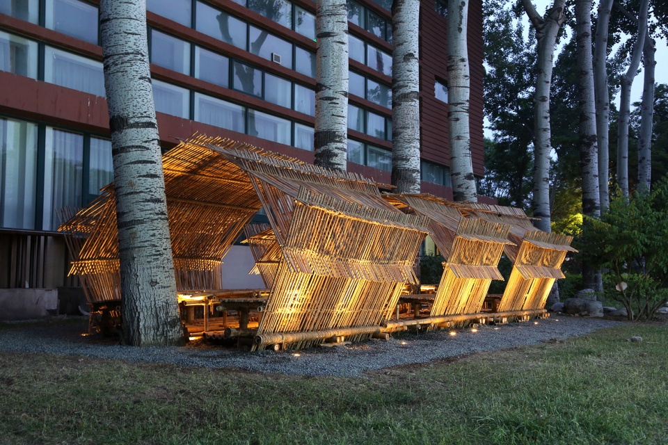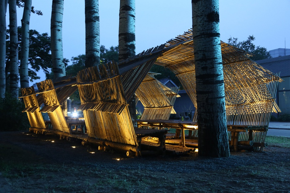 茶会主会场之一的和苑咖啡馆对面有一排四棵毛白杨,姿态参天挺拔。拟依托这四棵杨树的空间创作追光茶寮为会场增添记忆点。设计采用不同粗细规格的标准竹竿,采用中国传统木拱廊桥的结构方式进行搭接。粗的作为桌椅和栈道的基础,细的作为桌椅的面材及茶寮遮阴的材料。整体造型颇似江南水乡的乌篷船,成为主会场极具标识性的艺术装置。