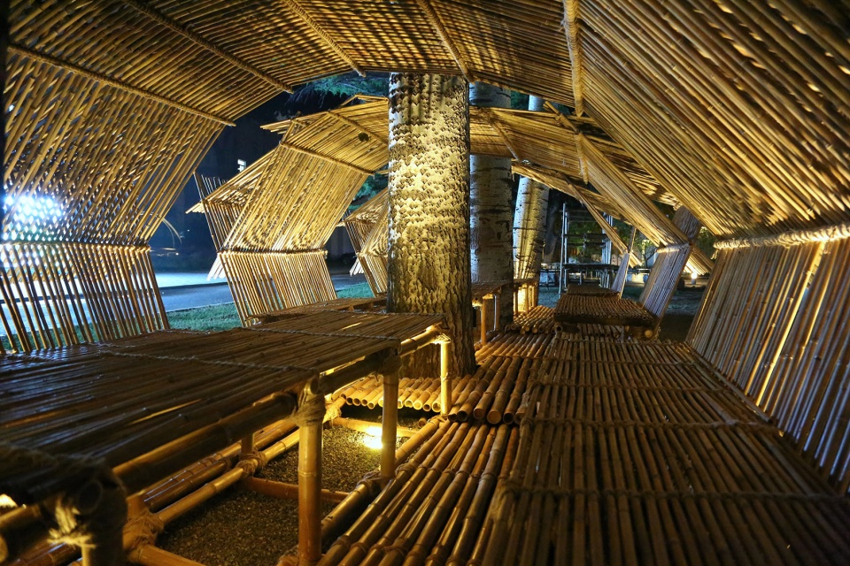 Coinciding with International Tea Day, the project introduced two temporary tea spaces. Bamboo, chosen for its affordability and resonance with tea culture, became the primary material. Inspired by Jiangnan oil-paper umbrellas, the design featured a poetic pavilion constructed with 1.8-meter bamboo poles. The structural simplicity allowed faculty to actively participate in its assembly. The result was an umbrella-shaped pavilion—a fusion of structural mechanics and aesthetics.