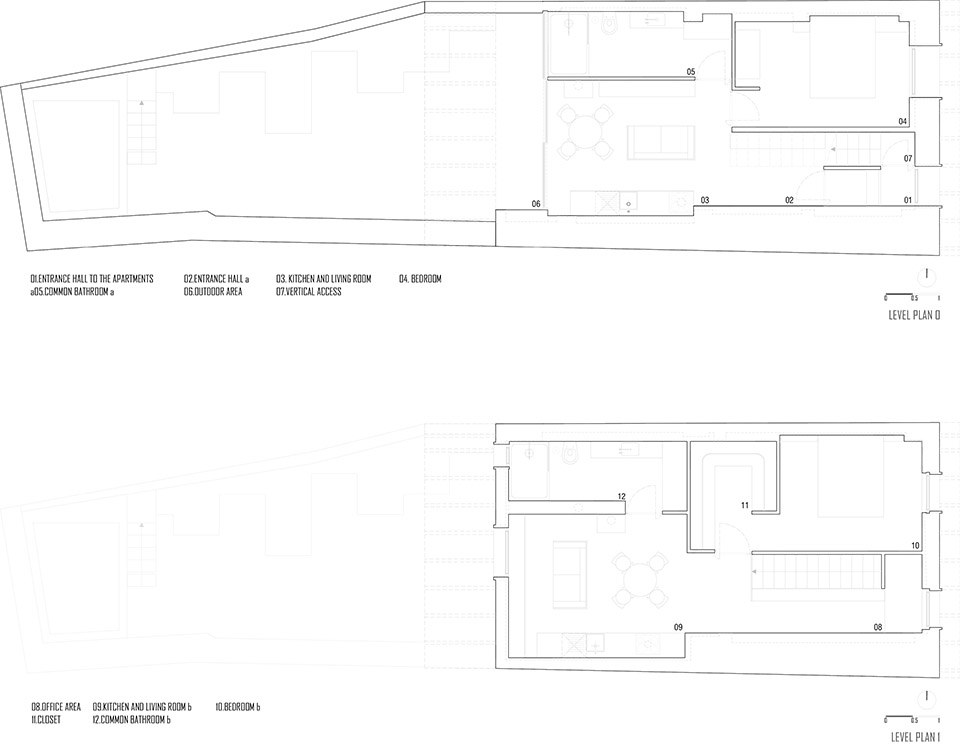 The project is divided into two one-bedroom apartments, each on one floor. Each apartment consists of a bedroom, kitchen, living area, bathroom and, on Plan Floor 1, an office and closet. The vertical access is the element that delimits and defines the distribution of the apartments.
