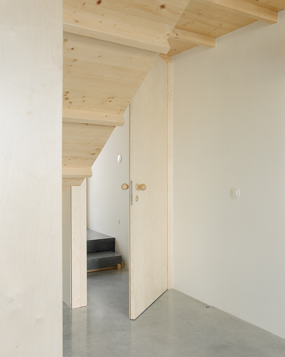 该项目分为两套一居室公寓,每层有一套公寓。每套公寓包括一个卧室、厨房、起居区、浴室,并且在一层还有一个办公室和衣帽间。核心筒是划分和定义两套公寓布局的关键元素。