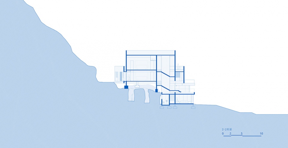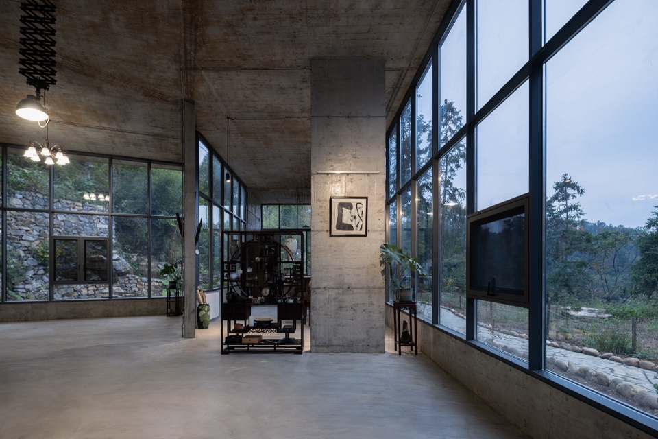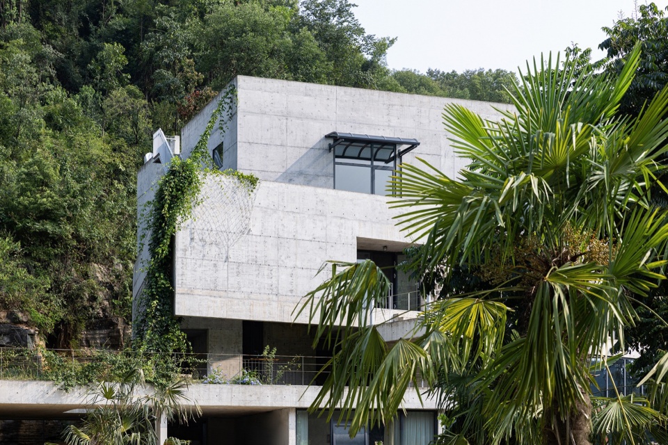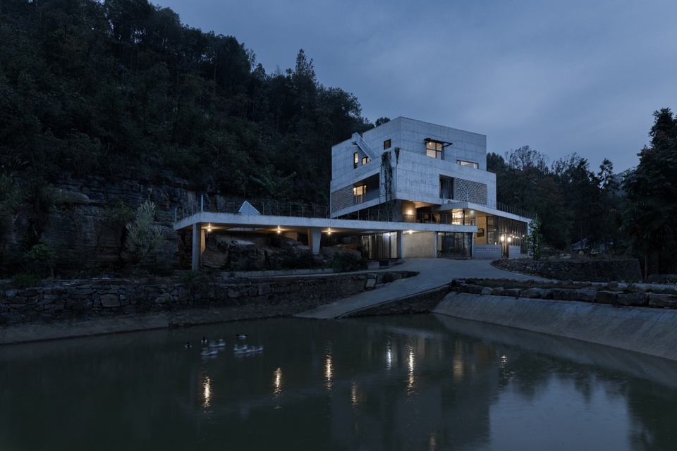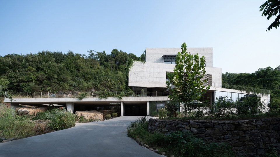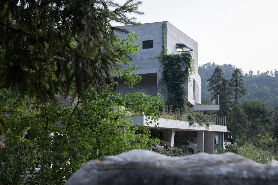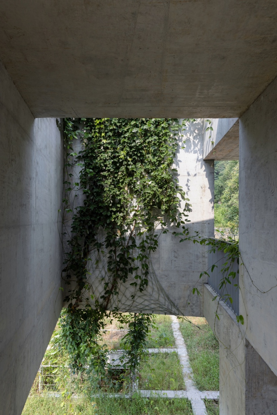 The building is constructed with cast-in-place concrete, with some of the first floor using stone columns and the roof covered by soil inserted into the mountain, which creates a space that is in harmony with nature while reducing the sense of volume of the building. The concrete wall serves as a natural backdrop, and the rotating space, which is either virtual or real, is covered with climbing vines, looming in the mountains. The upper layer of the non-overlapping section adopts the upturned beams, making the structural system appear layered and stacked like stones.