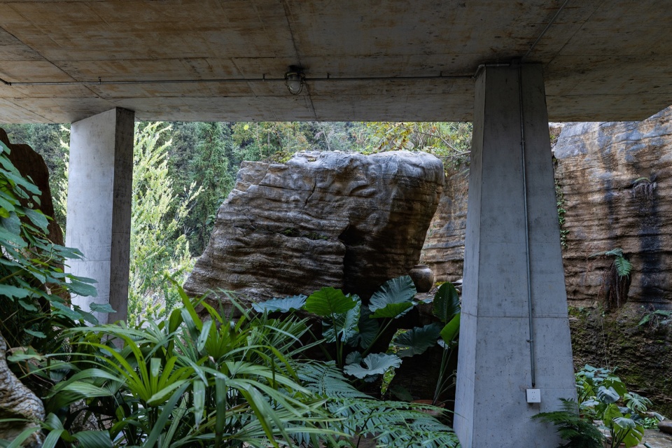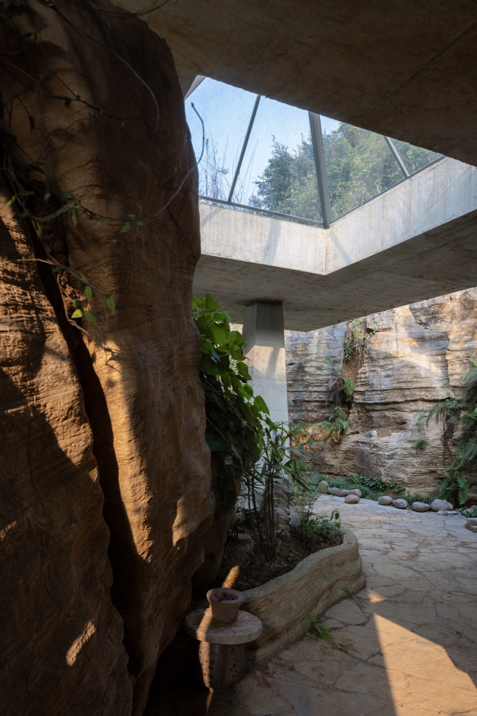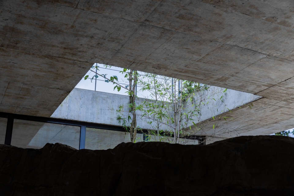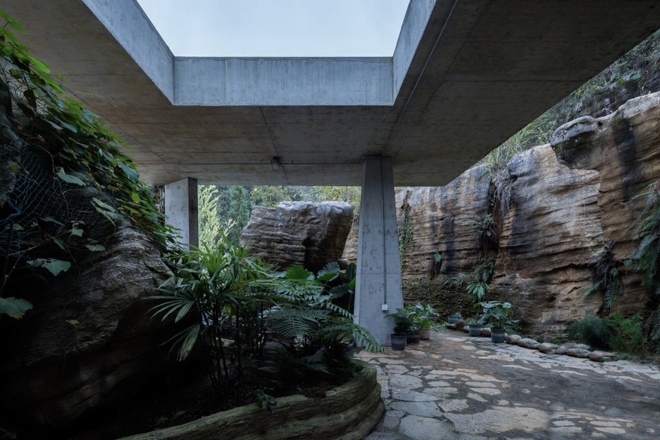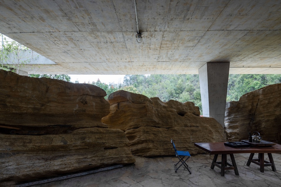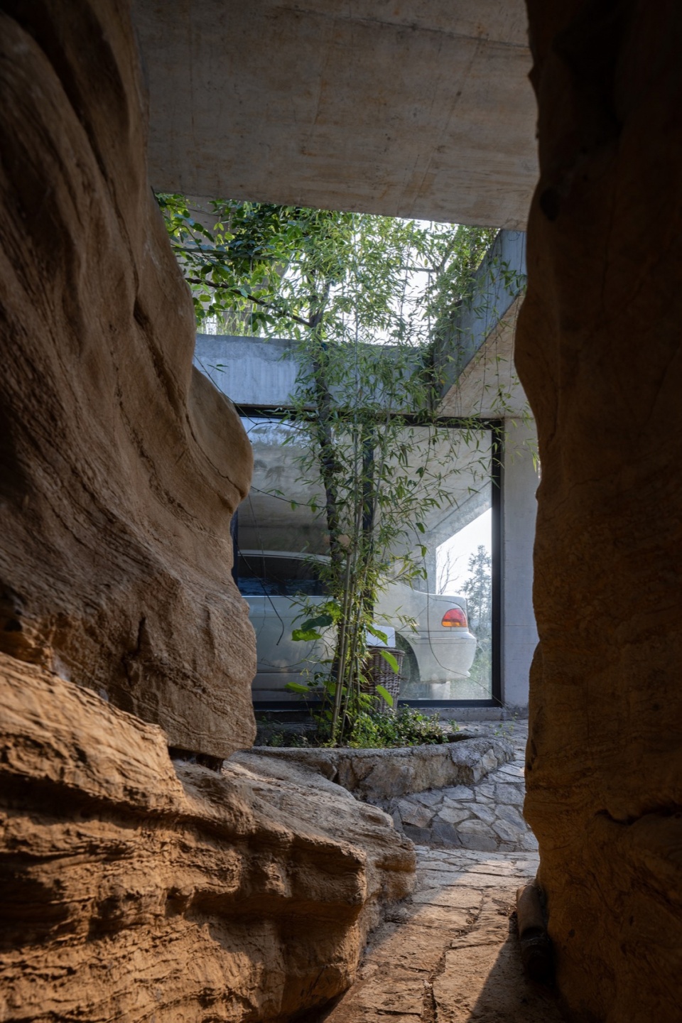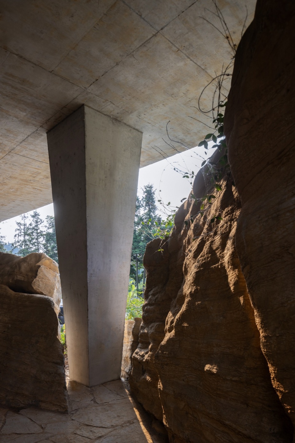 The exposed rock at the base is sufficient to serve as a bearing stratum incorporated into the structural system of the house. Due to the different shapes of the rock, after setting out, some structural columns fall on the rocks, while others fall in the gaps. To minimize the impact of foundation excavation on the space of the rock crevices and reduce the lateral thrust on the foundation structure during the rainy season, some of the load-bearing elements are converted by lifting beams. The main part of the building is made of a shear wall structure, which is conducive to the integrity of the interior space. The non-load-bearing parts are also cast in place, but the amount of reinforcement is reduced. The steel columns installed at the entrance, as a heterogeneous presence, are intended to reinforce its publicity. The floor slabs of the stone garden area, supported by four concrete columns with various shapes, contrast with the raw stone.