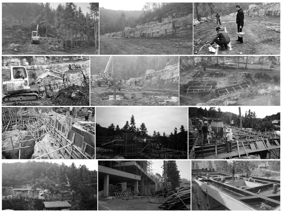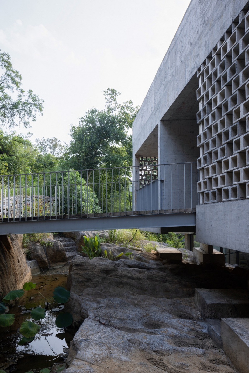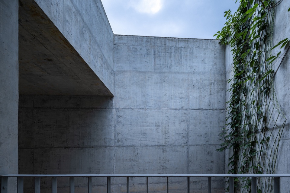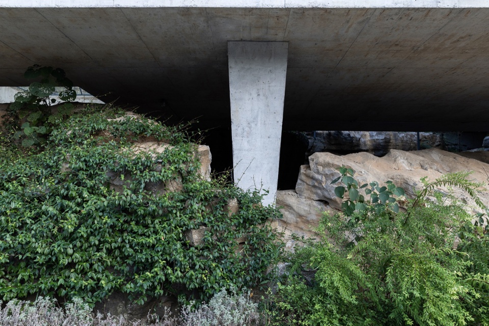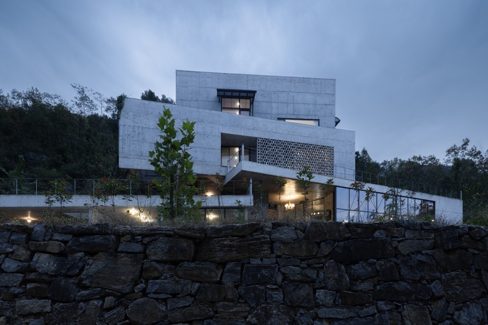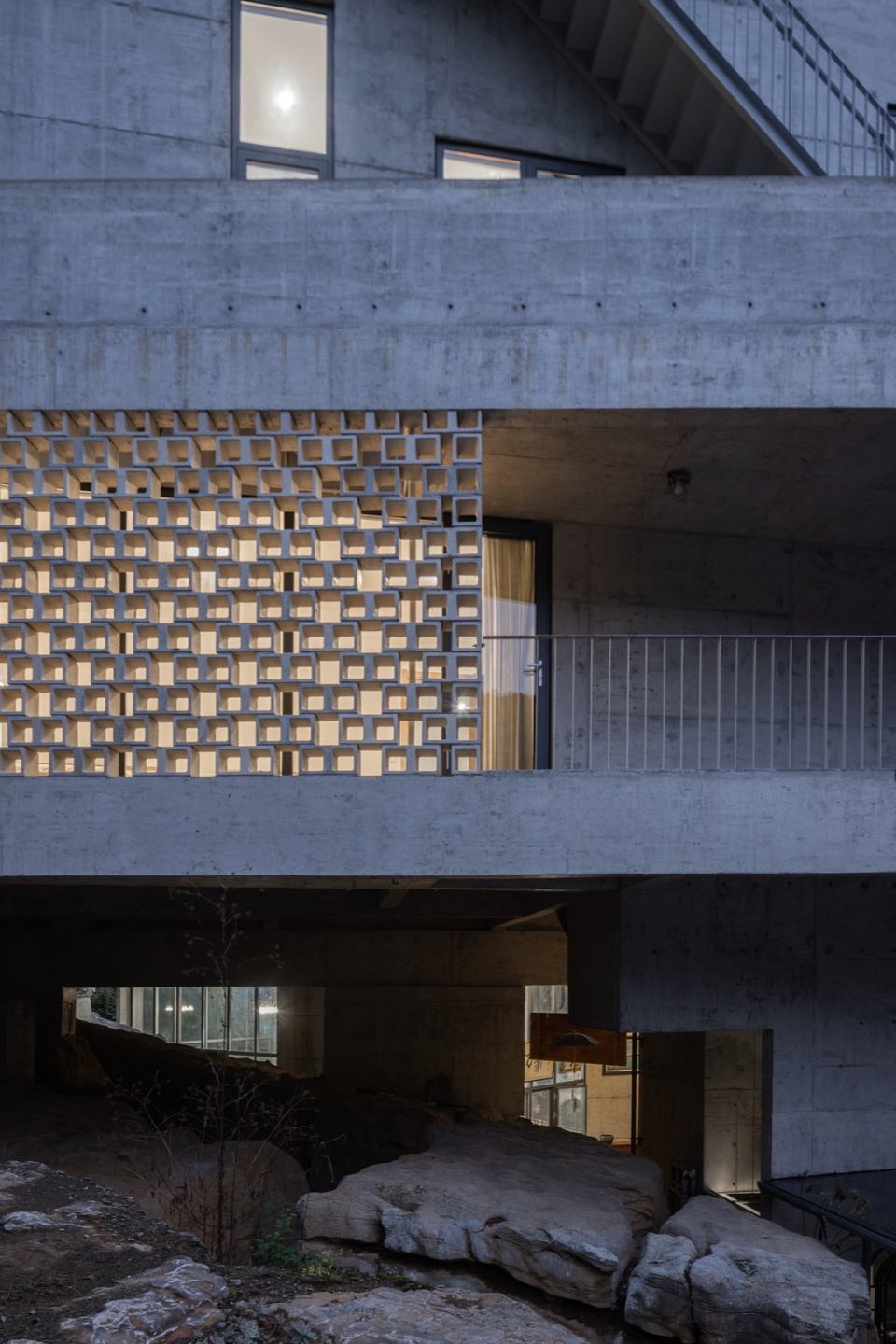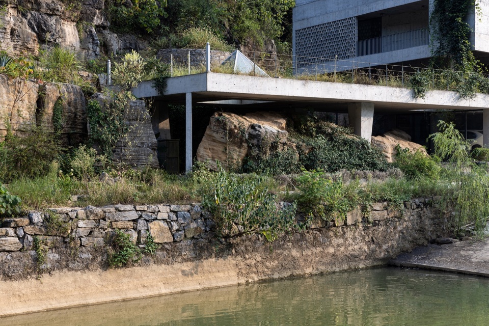 The exposed rock at the base is sufficient to serve as a bearing stratum incorporated into the structural system of the house. Due to the different shapes of the rock, after setting out, some structural columns fall on the rocks, while others fall in the gaps. To minimize the impact of foundation excavation on the space of the rock crevices and reduce the lateral thrust on the foundation structure during the rainy season, some of the load-bearing elements are converted by lifting beams. The main part of the building is made of a shear wall structure, which is conducive to the integrity of the interior space. The non-load-bearing parts are also cast in place, but the amount of reinforcement is reduced. The steel columns installed at the entrance, as a heterogeneous presence, are intended to reinforce its publicity. The floor slabs of the stone garden area, supported by four concrete columns with various shapes, contrast with the raw stone.