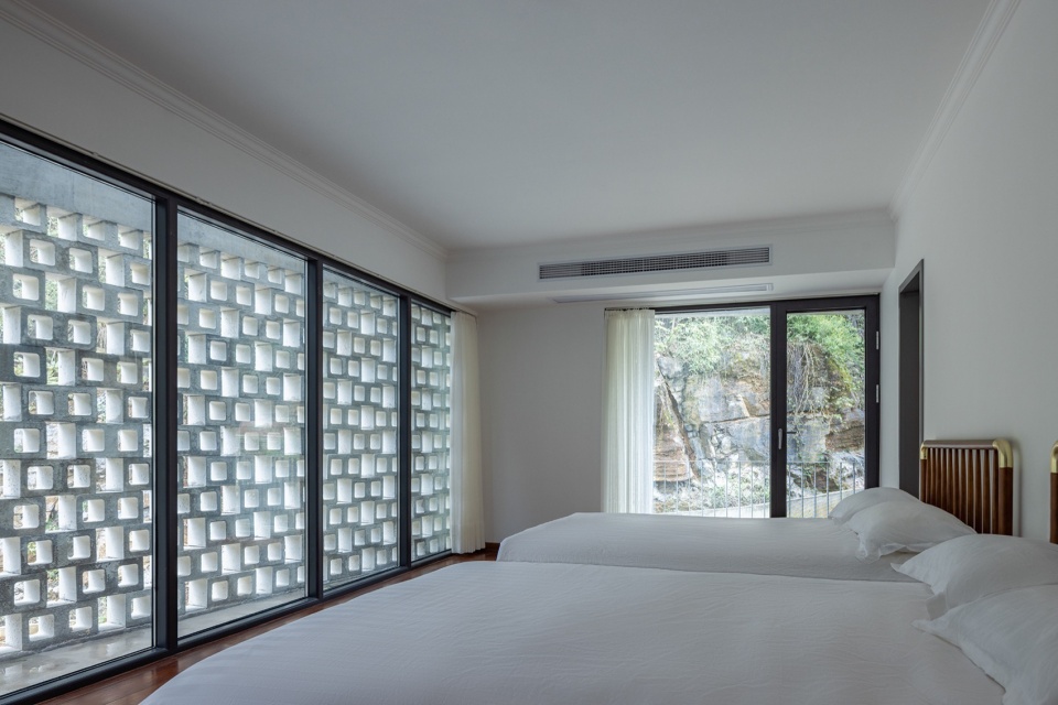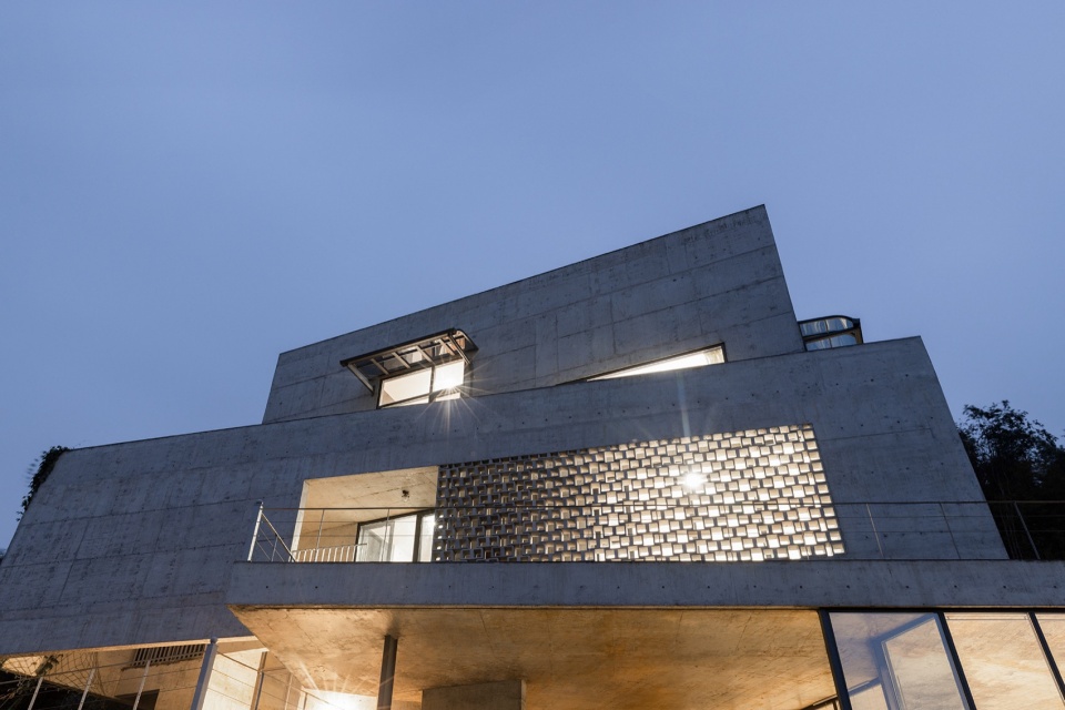 Due to the limitation of floor space, the upper dwelling is like two stones stacked together, unlike the flowing space in the bottom. A staircase and elevator in the middle of site open to the first floor, which provide accessibility to the living rooms on the other floors. Each room occupies a corner and has a relatively independent view. The two layers of stone blocks are rotated at a horizontal angle of 12 degrees, and the staggered structure creates a space where the second floor is a balcony and the third floor is a terrace. The split air conditioning is also hidden in this rotating crevice. Clients can enter the second floor of the building directly from the back hill and access to the various spaces via stairs. The balcony is enclosed with hollow bricks, which allows for sunlight while relatively shielding external visual interference. The third floor has its privacy, and an open terrace provides a distant view.