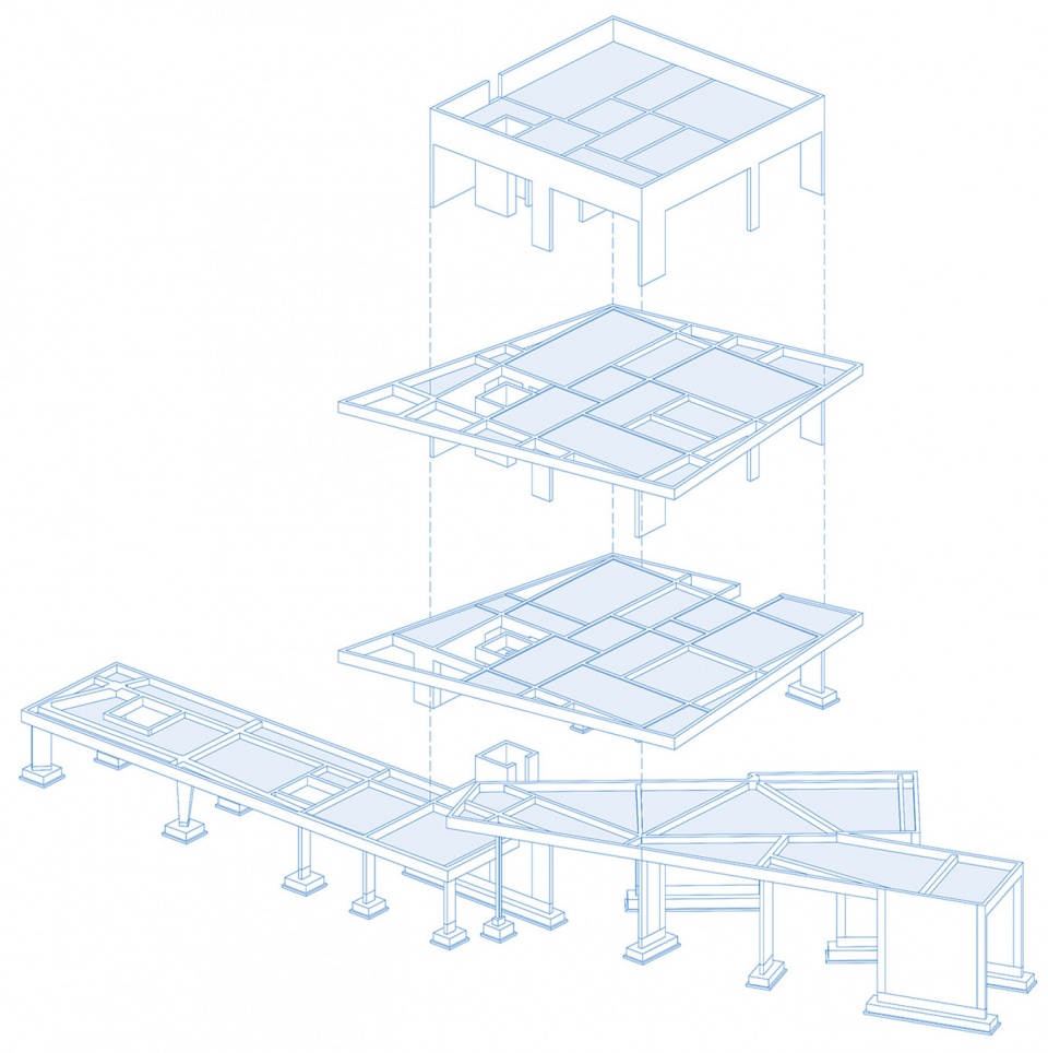 基地裸露的岩石足够作为持力层,纳入房屋结构体系的一部分。但其高低错落形状各异,放线后结构柱部分落于石上,而局部落在夹缝里。为了尽量减少基础开挖对石缝空间的影响,同时减少雨季对于基础结构的侧推力,部分承重构件通过抬梁转换。建筑主体部分全部采用剪力墙结构,利于室内空间的完整。非承重部分同样现浇,但配筋量减少。入口处设置的钢柱,作为异质存在,意在强化其公共性。原石花园区域的楼板,靠四根形态各异的混凝土柱体支撑,与包浆的原石形成对照。