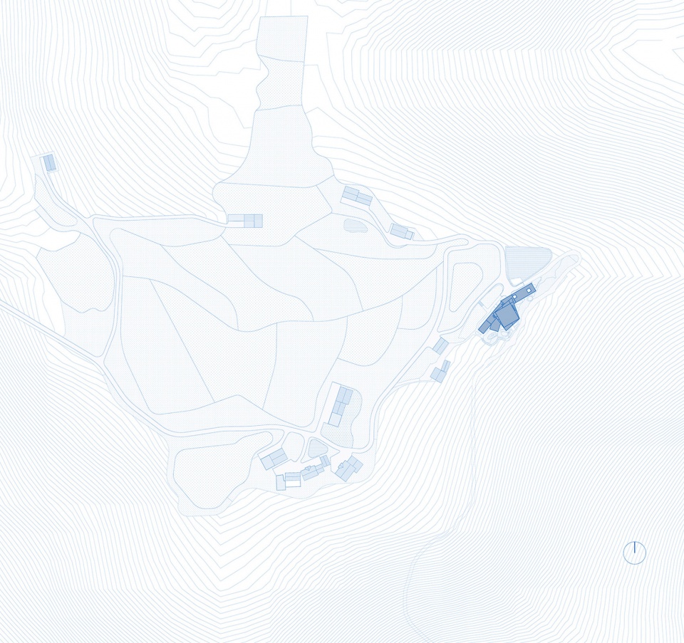 In terms of the spatial building layout, after leaving a path to the back mountain, the building is as close to the mountain as possible, landing on exposed rocks. The bottom of the volume is composed of slabs as the ceiling and stones as the walls. Due to various arrangements of the rocks, the “gaps” create different “hall” spaces. The north side, where the rocks are most concentrated, is an open “hall”. Meanwhile, the south sides with scattered stones is enclosed by glass to form a restaurant. The space behind it, with mountains and rocks as a backdrop, is the most peaceful place and Mr. Xu’s studio. The rest of the stone gaps are very narrow. Some are below the second floor slabs, providing shelter from wind and rain. The others are exposed to the outside, forming unique stone gaps’ corridors.