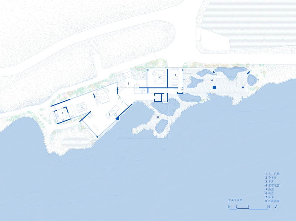 建筑布局是在考虑场地东侧留出后山的道路后,让建筑尽量靠近山体,落在裸露的岩石之上。底层以板为“顶”,以石为“墙”。岩石的疏密不一而形成不同的“厅”。在岩石最为密集的北侧,作为开放的“厅”,而稀疏的南面则用玻璃围合成餐厅,其背后的近山空间有山石作为背景,最为宁静,是徐老师的画室。其余被清理出来的石缝,非常狭窄,有的在建筑二层楼板的下部,可遮风雨;有点则裸露在外面,形成独特的石缝游廊。