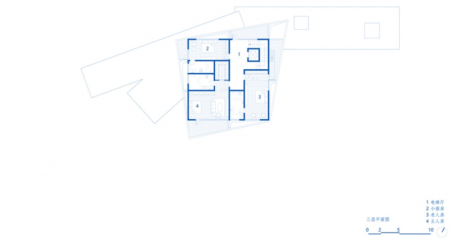 由于占地面积的限制,相对于底层的舒展,上部的“居”则是像两块石头堆叠在一起。场地中部设置的楼电梯,在首层开放,并便捷的联系其余各层居室空间。每个居室各占一角,拥有相对独立的风景。两层“石”块以水平12度旋转,通过形体结构的错动形成二层阳台和三层露台的空间,房间的分体空调也藏于此旋转的夹缝之中。从后山可进入建筑二层并通过楼梯进入各个空间。阳台用空心砖稍作围合,获得阳光的同时,相对屏蔽外部视线的干扰。 三层自身已具有私密性,用开放的露台可以得到远眺的视野。