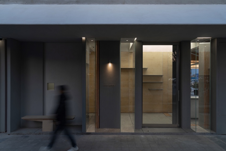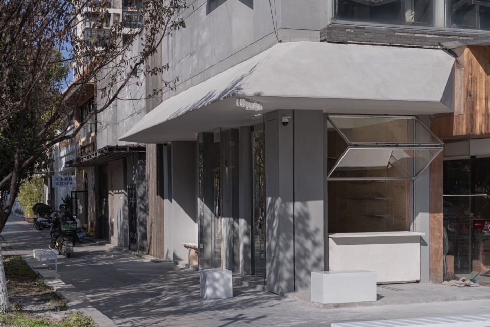朝向街道的内立面较长,在另一个端头,我结合廊柱设计了一个凹槽,以及两组推拉门,推拉门呈90度分别朝内与朝外开启,可以最大程度的打开外立面,预留了第二橱窗的使用可能,也方便货物与设备的进出。推拉门关闭状态下,凹槽内放置长椅,成为一个小的灰空间,供人休憩。