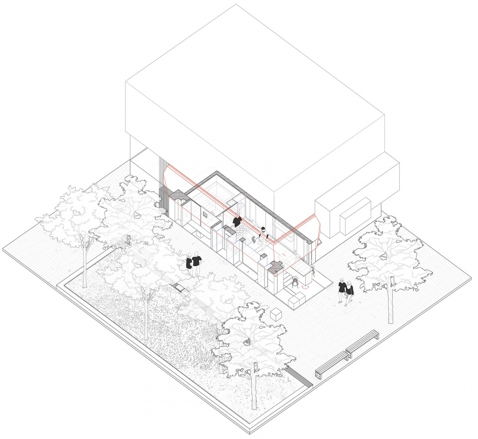 Through multiple modes of opening different areas of the facade, the previously constrained site expands outward toward the street, creating a more generous shared space. The narrow main facade facing the city can be fully opened with fold-up windows and rotatable sliding table, offering flexible spatial uses and integrating furniture shared with the street.