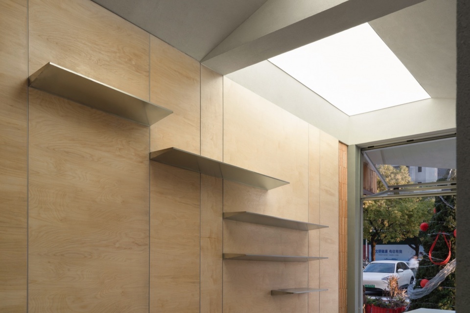 The overall raised and expanded floor gives the store a three-dimensional and well-organized base contour. concrete is used, mixed with the red bricks of Jingdezhen. Seam alignment between the floor and walls are created based on the original structure. It highlights the refinement and order of the space, while responding to the texture of the original site. The interior facade makes use of the alignment of the space’s seams, skillfully combining natural birch plywood, galvanized panels, and curved ceramic tiles. These materials are arranged in a staggered pattern, presenting a contrast between warm and cool materials, adding more layers and order to the space.