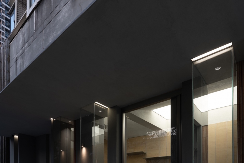 空间的狭小与原始立面的杂乱成为了设计需要解决的问题。以此作为切入点,结合现状立面上大小错落的柱子,我设计了一个由室内延伸到室外的屋檐,柱子+屋檐这两个建筑元素构成了一个亭廊。它不仅嵌入室内空间之中,也延伸到室外。朝外部份悬挑形成屋檐,朝内部分则结合原始结构设计了对应不同功能分区的照明系统。