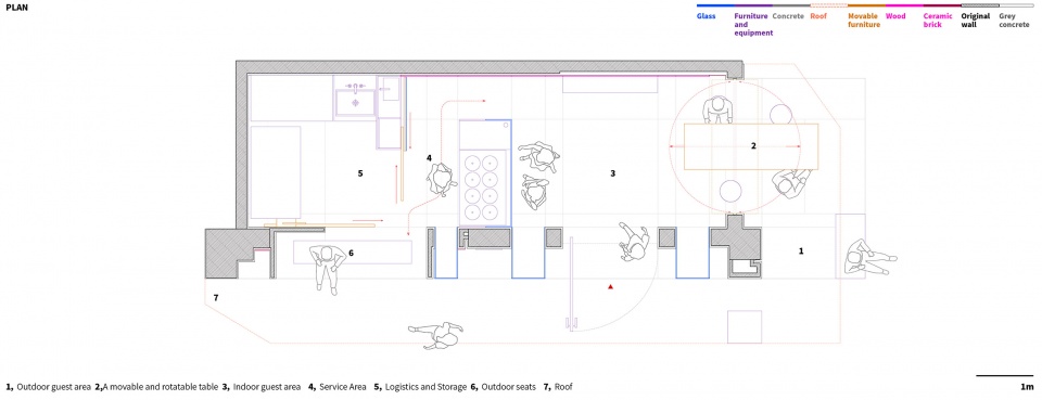 我们沿着长边依次布置后勤储藏区,收银接待区与客座区,且依据功能外立面从封闭到通透。内部的两个推拉门用于分隔后勤区与前区,这两个推拉门之间隐藏了一个收纳柜,柜内集成了小水池,满足前区的各种使用需求。
