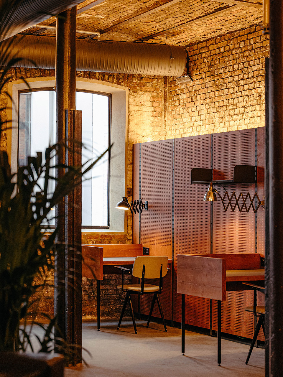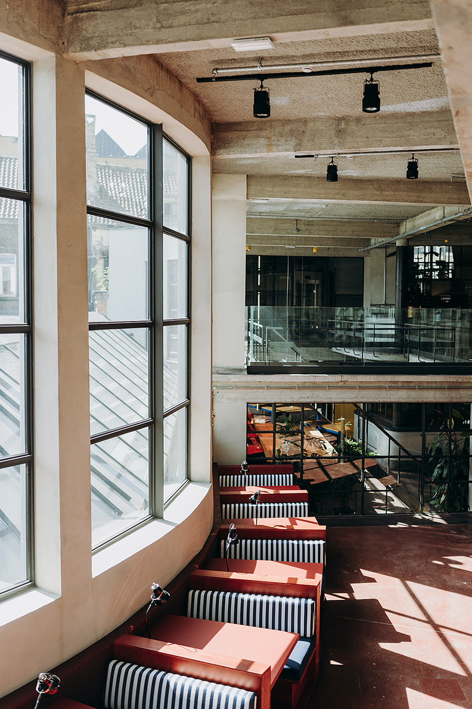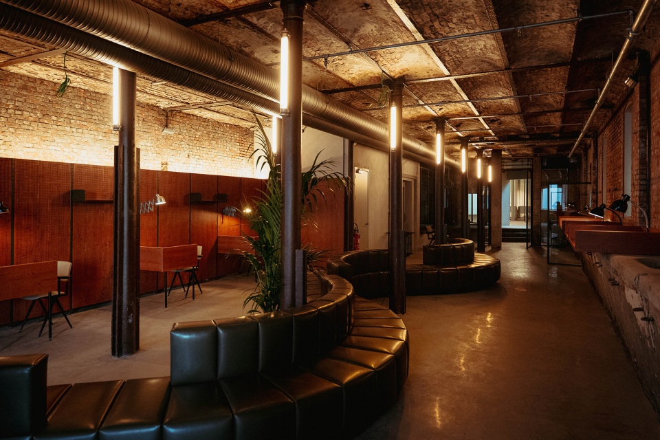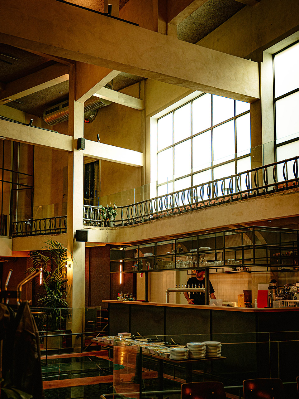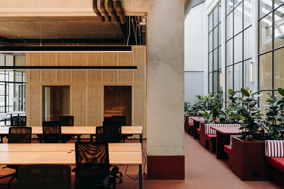 — Partial window opening on the wall brings light and air into the interior, allowing the overall space of the restaurant to flow.