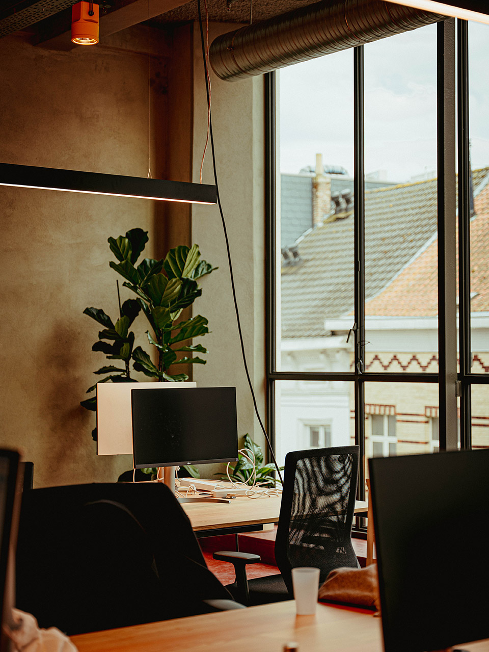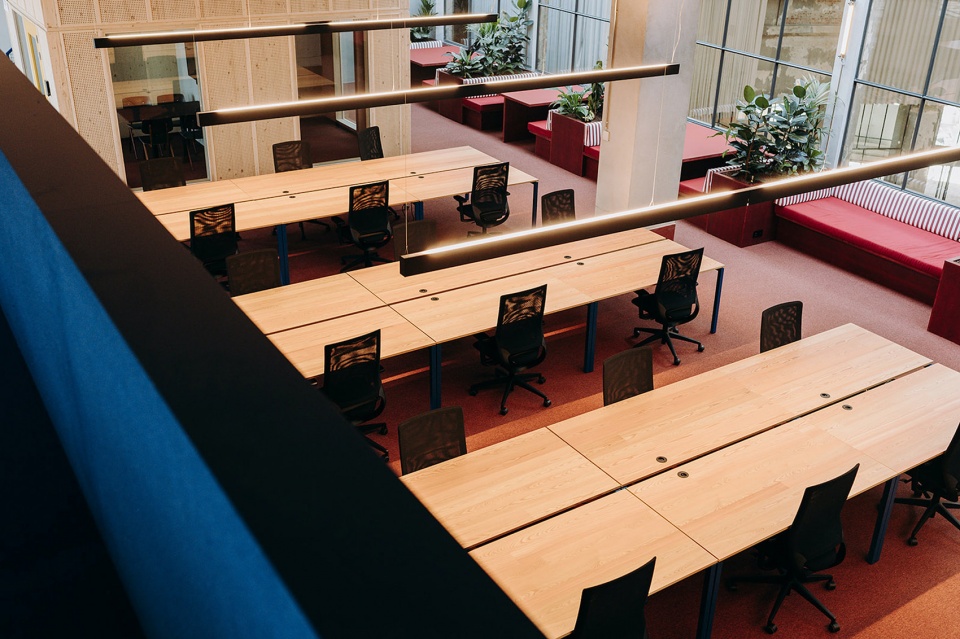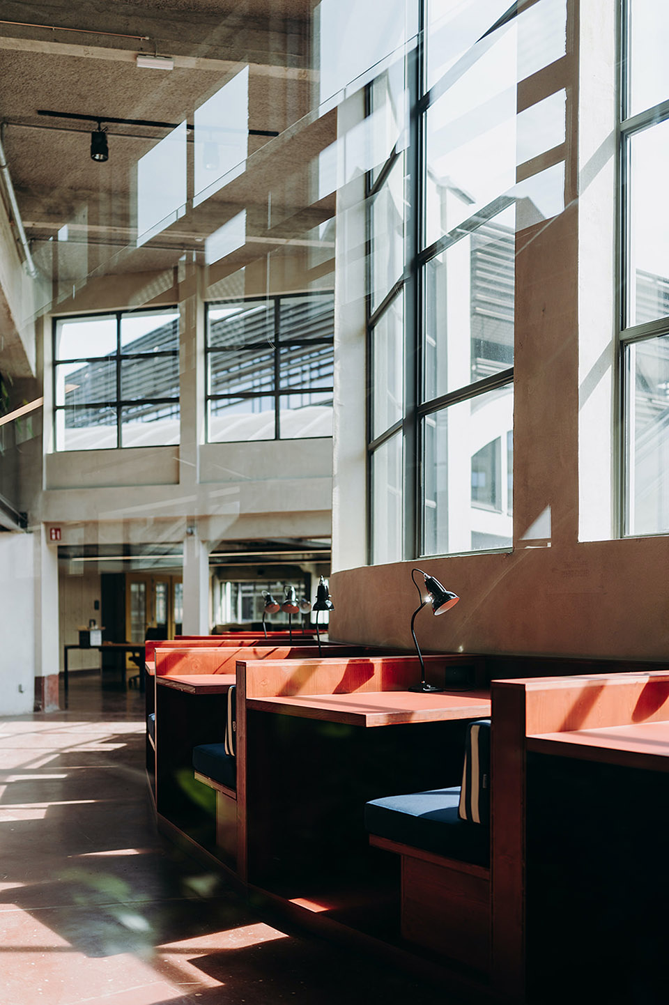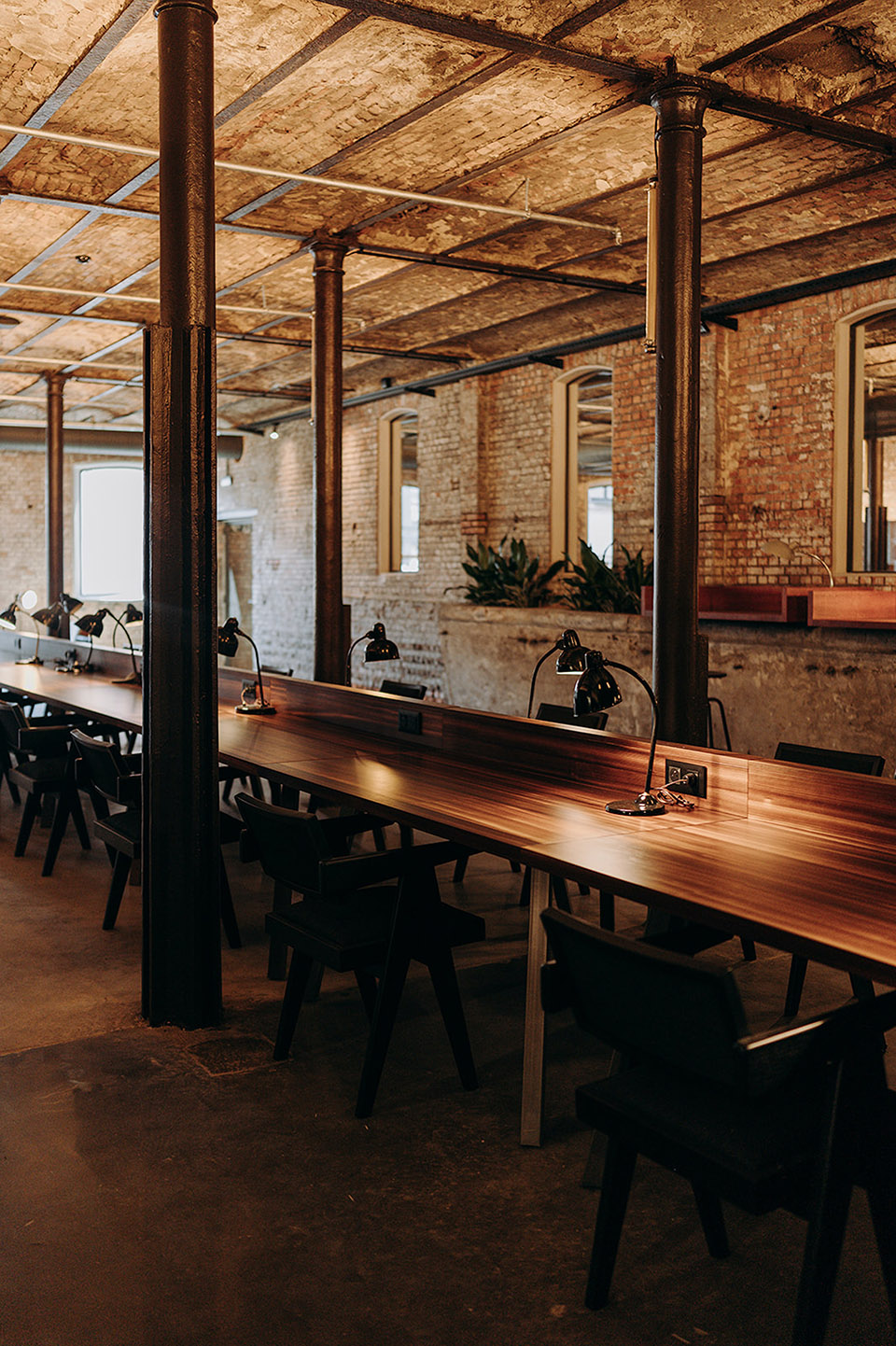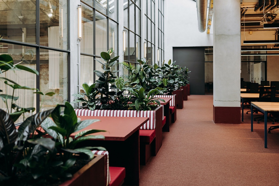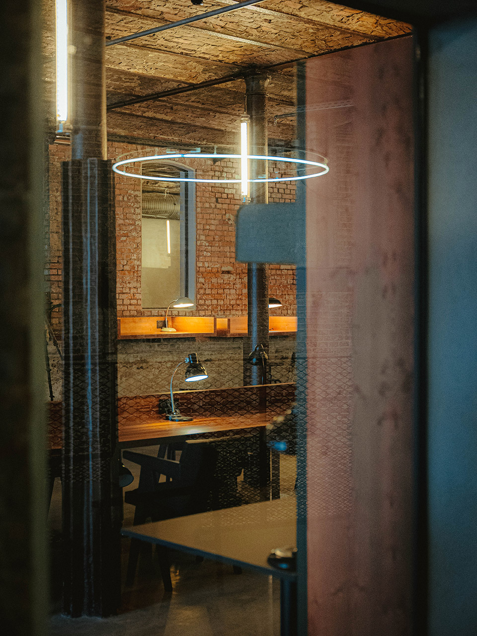 — Partial window opening on the wall brings light and air into the interior, allowing the overall space of the restaurant to flow.