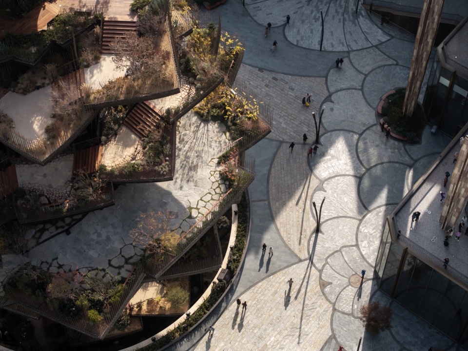 Xi’an Tree is the central landmark of the China Resources Land International Culture and Business Center (CCBD) in Xi’an. It is located in the center of The Mixc Plaza and rises up from the subterranean level, consisting of 60 steel-structured giant leaves in a 57m-high longitudinal park. The leaves restore seven ecological features along different heights, such as Dry steppe, Arid Dessert, Xeric shrubland, Temperate Broadleaf Forest, Mountain forest, Alpine tundra, and Temperate steppe, in order to express the horizontal geo-cultural and climatic representations in a vertical dimension.
