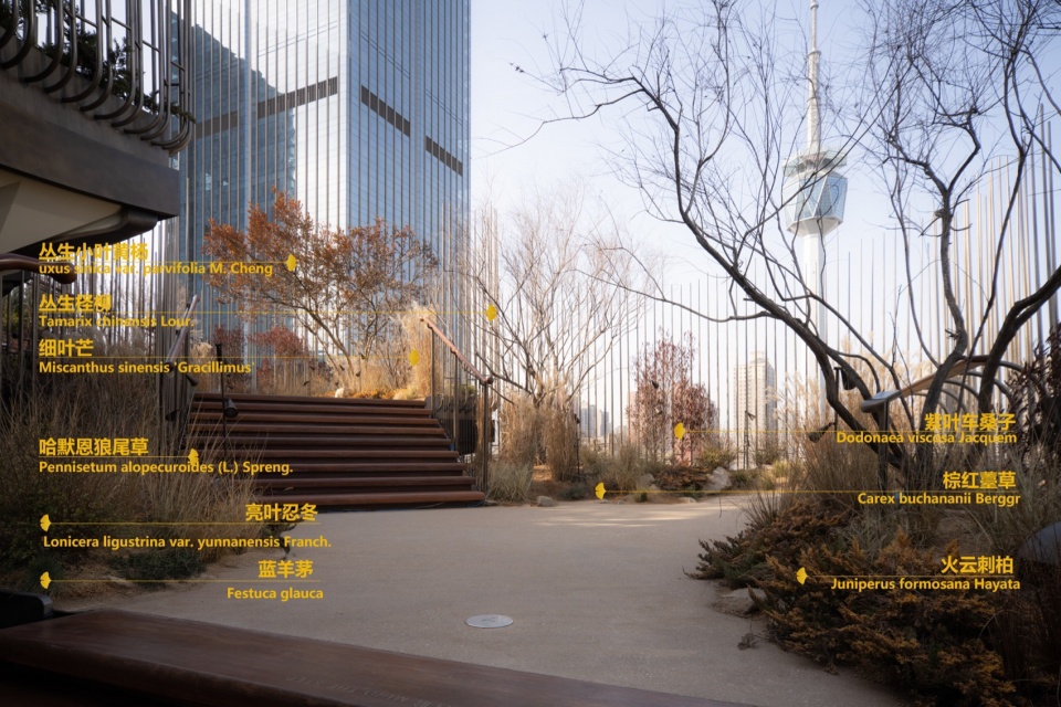 In the process of searching for plants, we traveled almost all over the country to build up such a complex plant framework bit by bit. In Gansu, we selected tamarisks and lemons in the Gobi Desert, in Hebei we searched for beautifully shaped avena, and in Shandong we searched for clumps of river birch. And the top layer of black pine is even ran to several places, and finally in Shandong Laiwu found a natural form of black pine and red pine. After many rounds of proofing and argumentation, the designer searched for the optimal solution along the plant mix to meet the durability and effect control to ensure their perfect landin