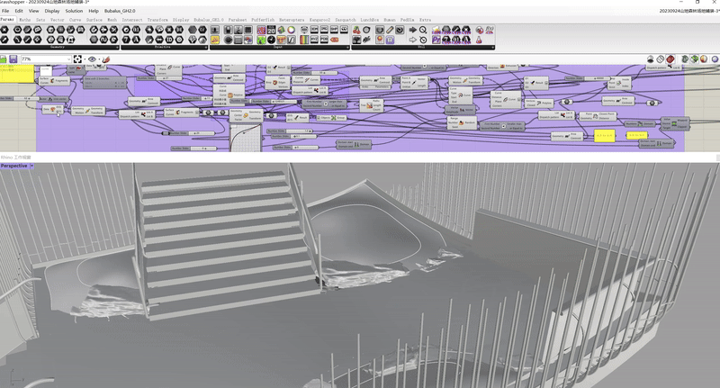 比如山地森林区域的铺装,材料选用了黑色沉积岩,它具有片状肌理,是一种符合山地森林气息的石材。我们使用Grasshopper中的算法以及其强大功能,模拟水流运动的方向和力量,实现自然水流的冲刷效果,并通过调整参数实时观察到水流冲刷后的变化。