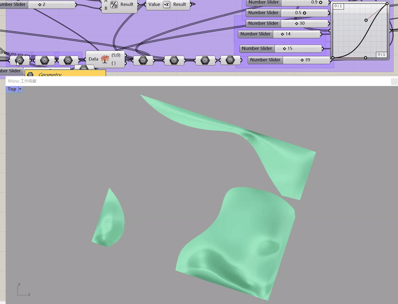 第一步输入基础线(Curve),使用该基础线(Curve)去把基础面进行分割(SrfSplit),分割后就得到地面铺装的基础形态。第二步通过缩放(Scale)把分割出来的面进行缩放,再提取出缩放后基础面的边线,使用两点建立向量(Vec2Pt),通过点的向量去把边线进行抖动。最后调整图像映射器(Graph Mapper)的图像形态以及两点向量(Vec2Pt)的大小,将我们所需要的铺装形态、板块大小、铺装数量计算出来。