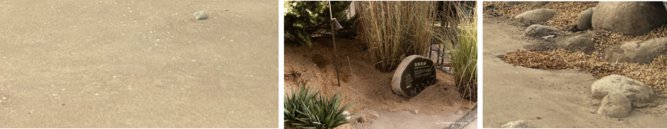 ▼几种材料的质地、颜色、肌理不同组合,实现了与相应生态区域特征的吻合,The different combinations of texture, color and texture of several materials achieve the coincidence with the characteristics of corresponding ecological regions
