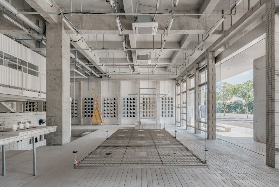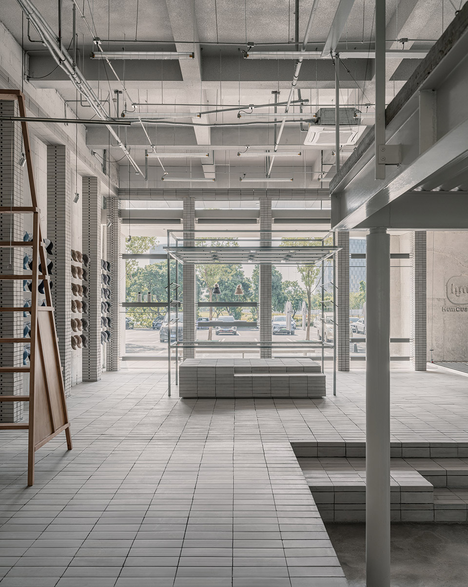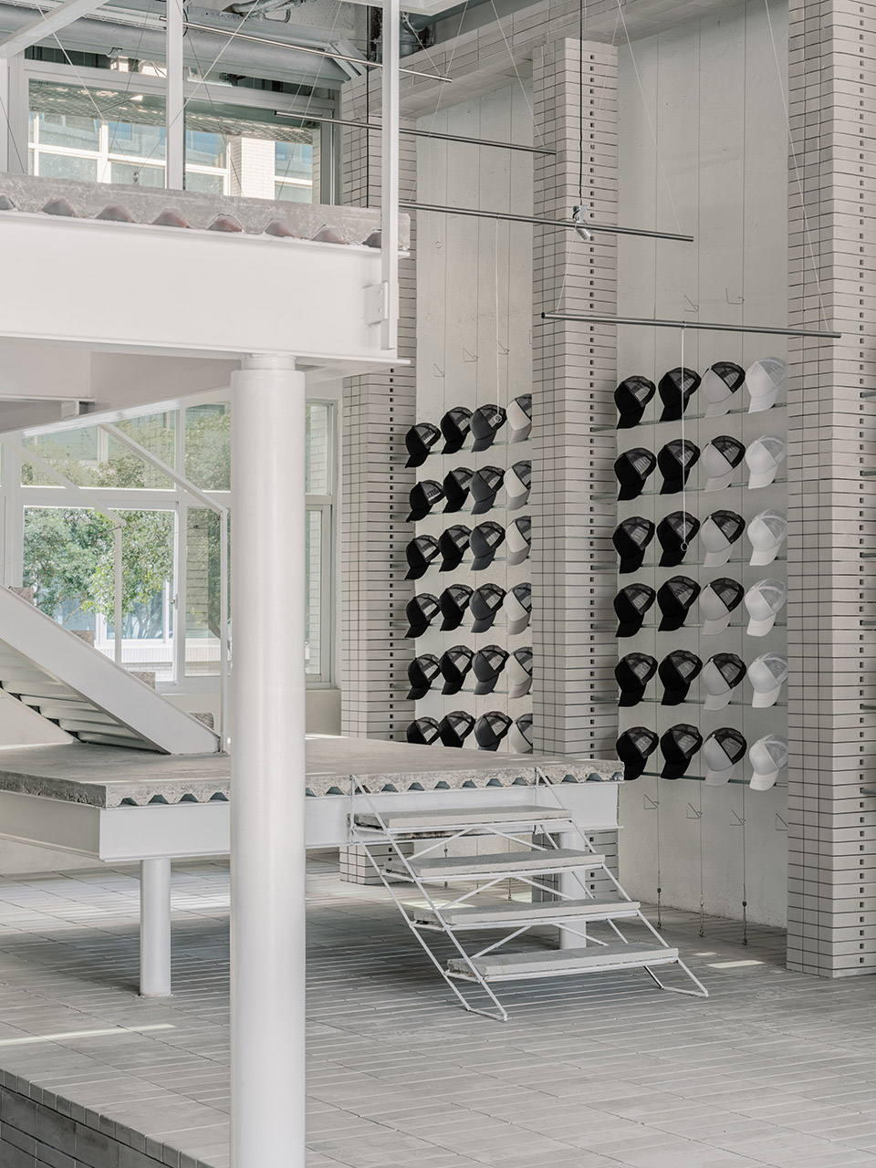 In this space design, basic architectural construction methods were adopted for the steel structure framework, concrete pouring floor decks, masonry of columns, and selection of assembly materials. The construction method of each component is clearly visible, resembling the brand’s intended expression—each serving as a base onto which different design patterns are imparted, forming the final desired products. In this space, these products also impart their essence to it.
