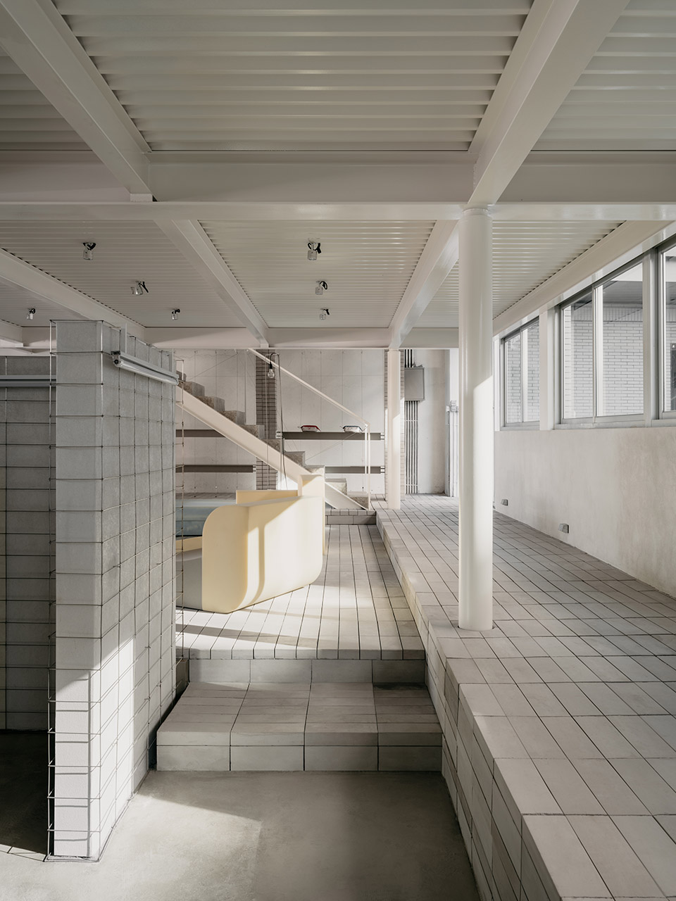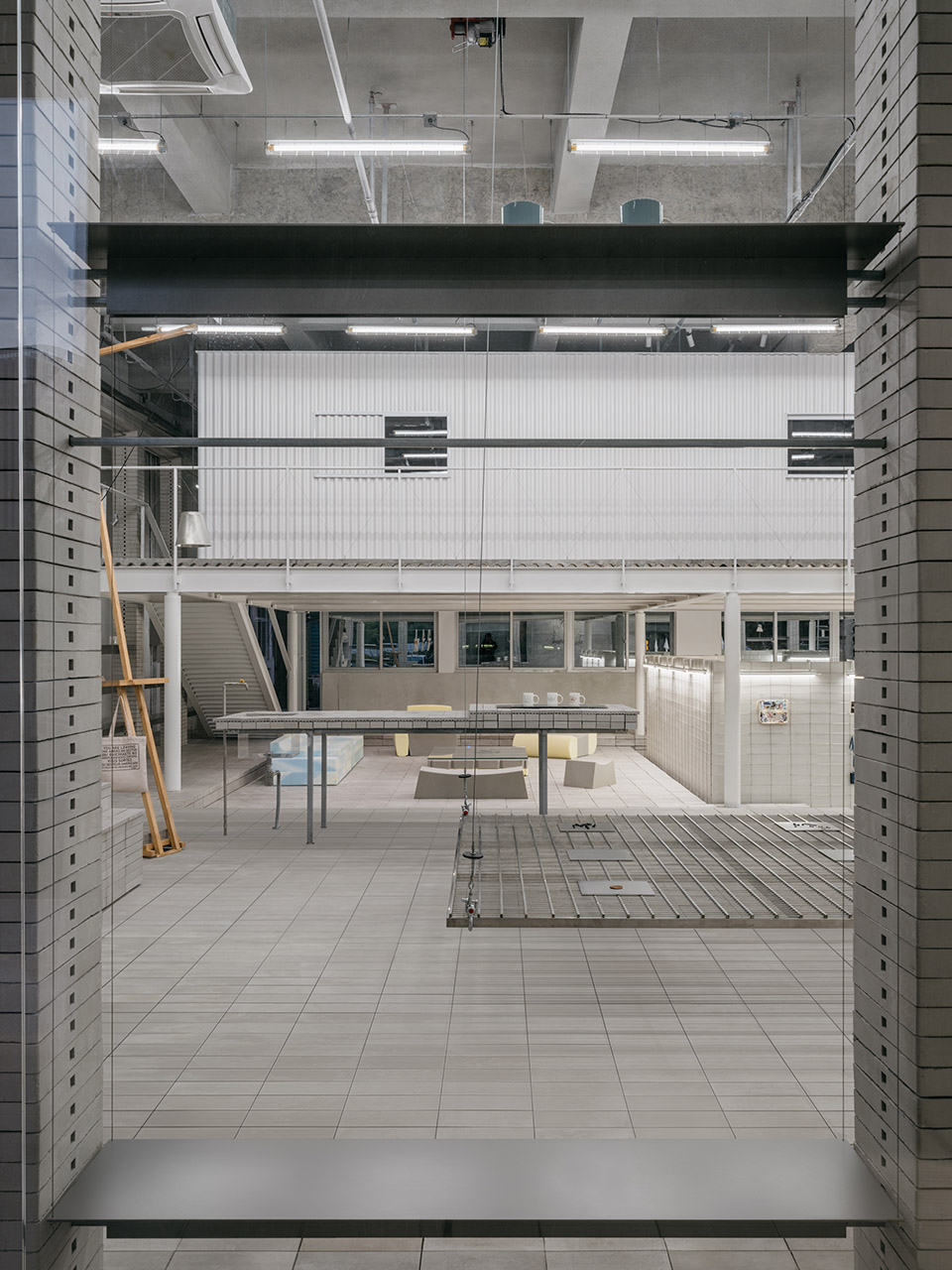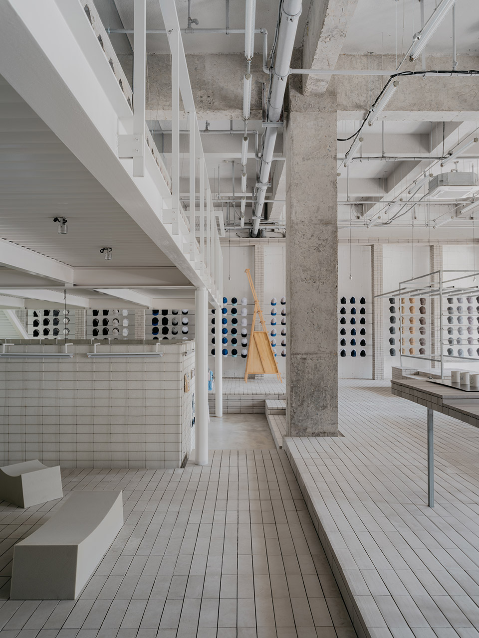 In this space design, basic architectural construction methods were adopted for the steel structure framework, concrete pouring floor decks, masonry of columns, and selection of assembly materials. The construction method of each component is clearly visible, resembling the brand’s intended expression—each serving as a base onto which different design patterns are imparted, forming the final desired products. In this space, these products also impart their essence to it.