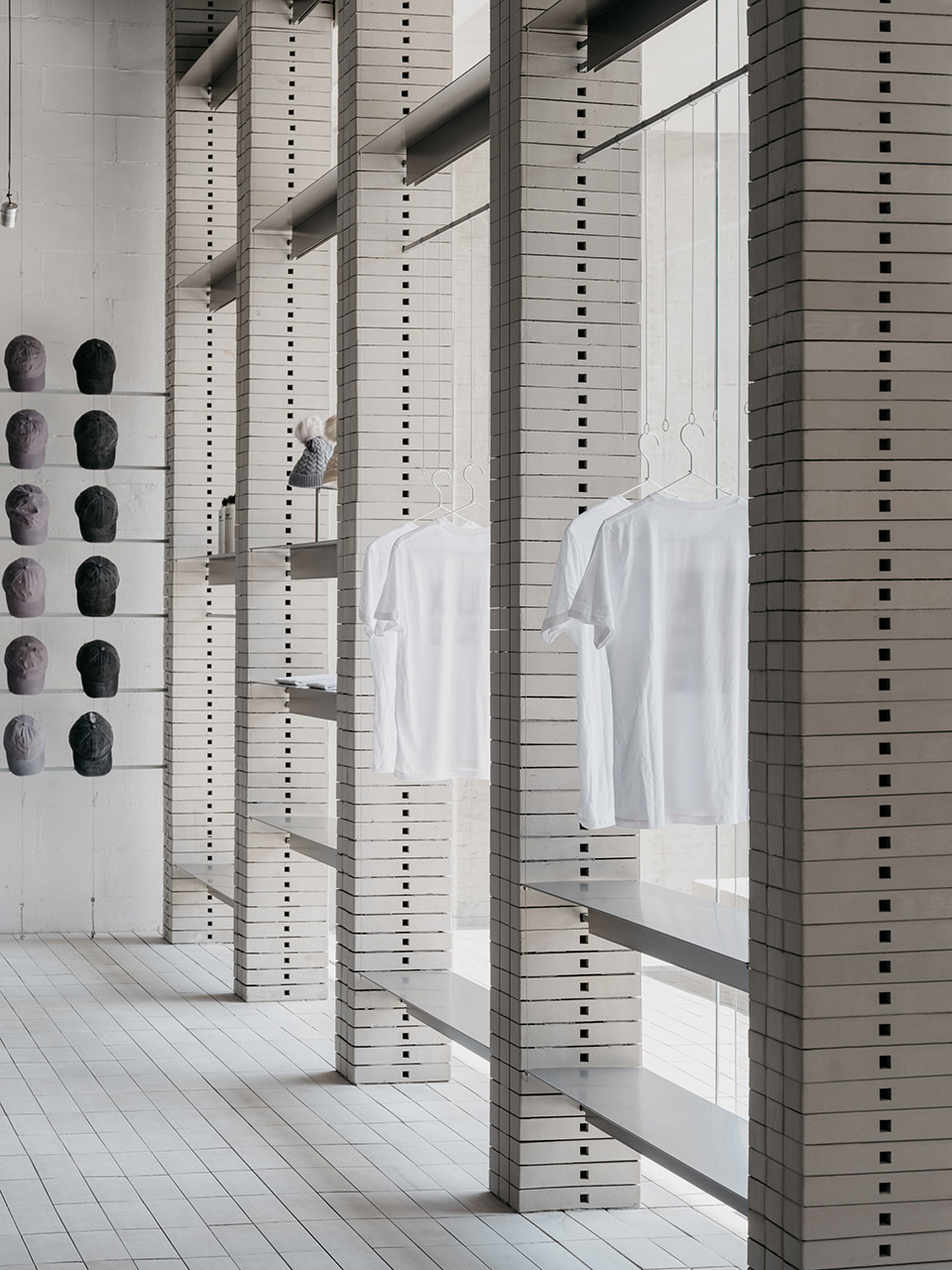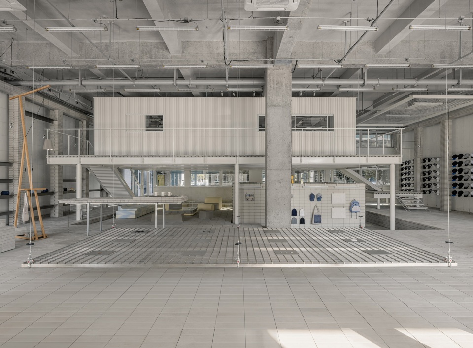 在这个空间设计中,从钢结构骨架、混凝土的浇筑楼承板、柱子的砌筑和装配材料的选择等,都采用了基础的建筑构造做法,每个构件的做法都清晰可见,跟品牌期望表达的想法相似,都同样作为一个基底,把不同的设计图案赋予到这个基底之上,即形成为最终所需的产品,在这个空间中,这些产品也赋予了这些。