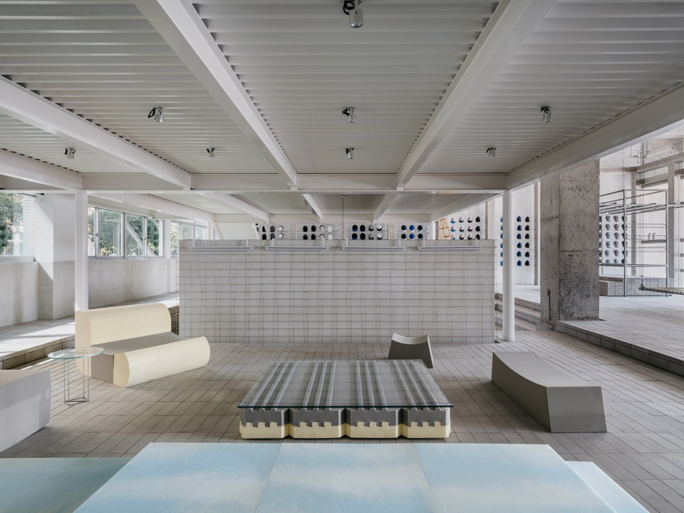 The area under the steel frame structure combines the function of both display and rest. Using original sponge as the basic material for furniture, functional lounging areas are formed through cutting and splicing, presented in the most modest manner through materials. As sponge will suffer from aging and discoloration over time, similar to traditional furniture factory practices, wrapping existing sponge furniture with new patterned fabrics creates new products, also serving as a direct display. The water bar, in addition to the role of providing water and tea for guests, also serves as a display stand for cups.