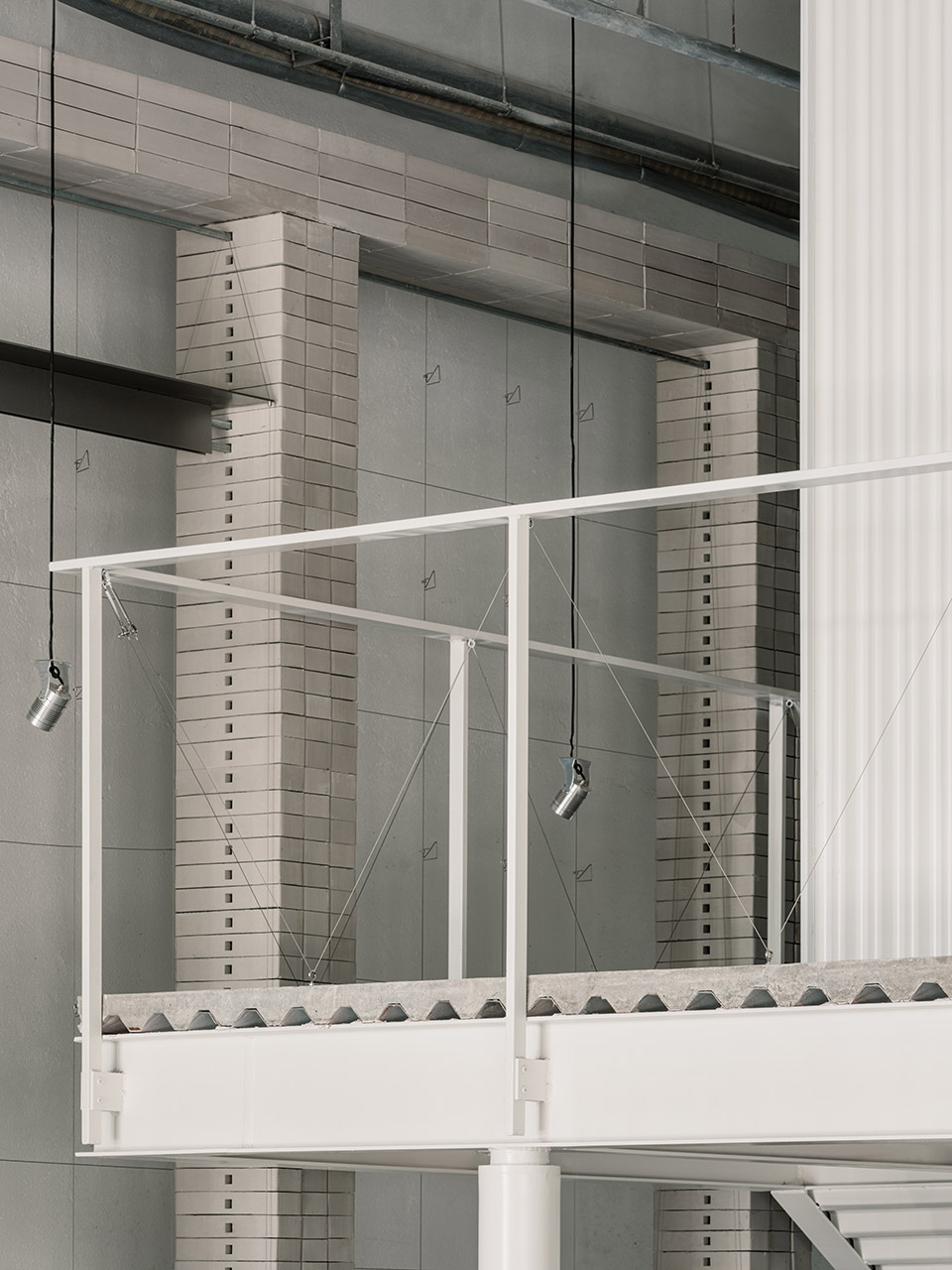 场地原始柱与大梁,褪去表层被处理的痕迹,恢复原有混凝土最真实的样子。在柱子与搭建的钢架结构之间,中间砌起的新空间墙面也成为了环形流线中需要被展示的部分。