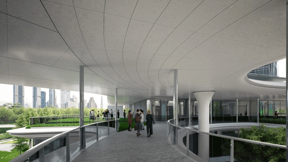 低区的“生境底盘”通过立体化路径串联8座塔楼和周边社区、滨江城市绿带,形成多维的公共系统:首层沿街设计为开放街区,10.5米标高处构建社区高线公园。通过街道近人尺度的商业盒子,水平错动的天街和片板绿化,以及被消解的建筑体量,来营造更具亲和力的城市空间尺度。