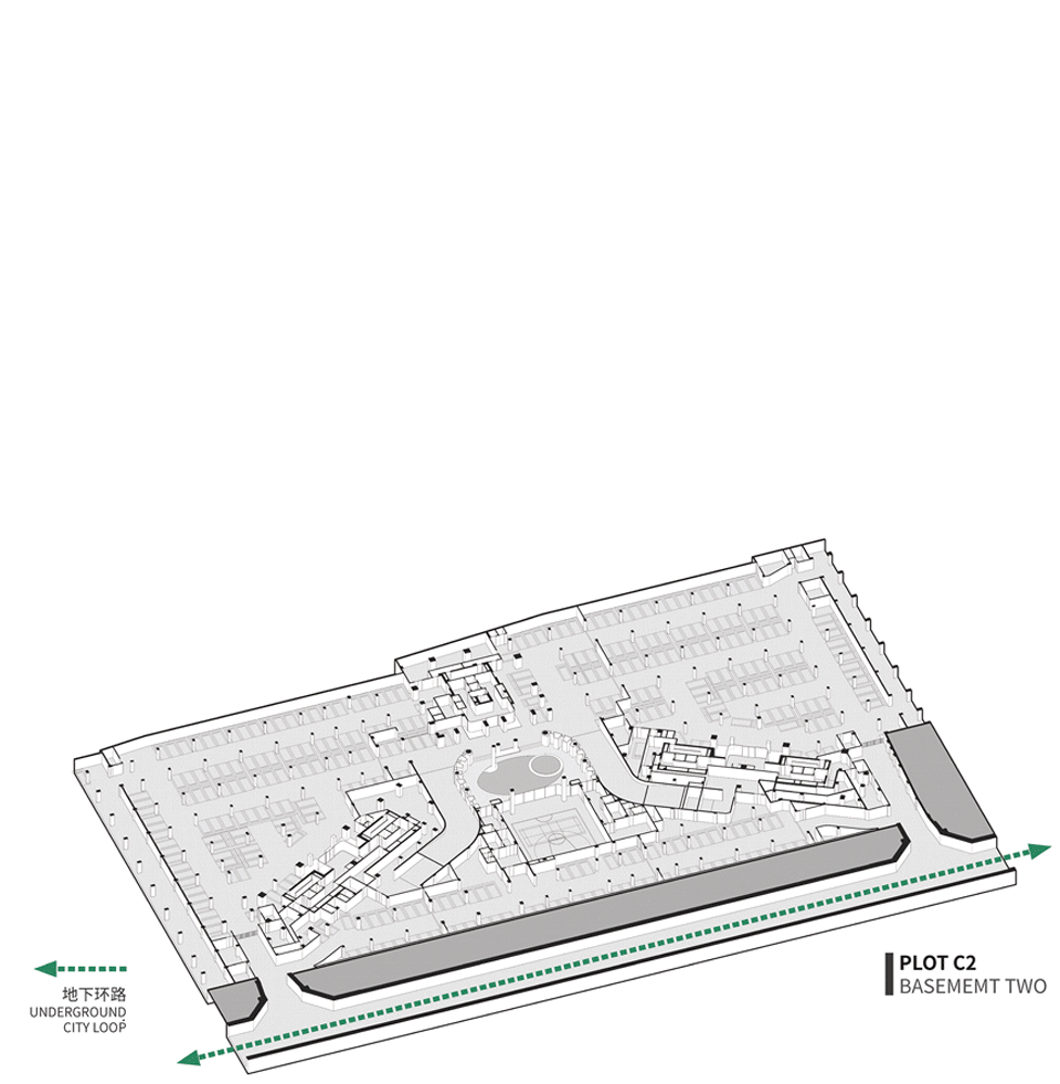 以C2地块为例。地下二层的地库空间衔接片区整体规划的地下环路,将部分停车位释放给城市。城市市民可经由公共车库、地下多功能厅的路径,或是通过沿街的艺术中心主入口,抵达“生机之环”中的共享功能空间。地面层则是与城市共享的商业街区、铁路文化步廊、垂江步行走廊。