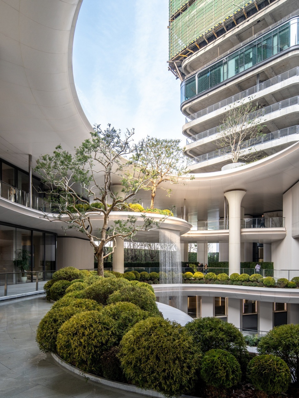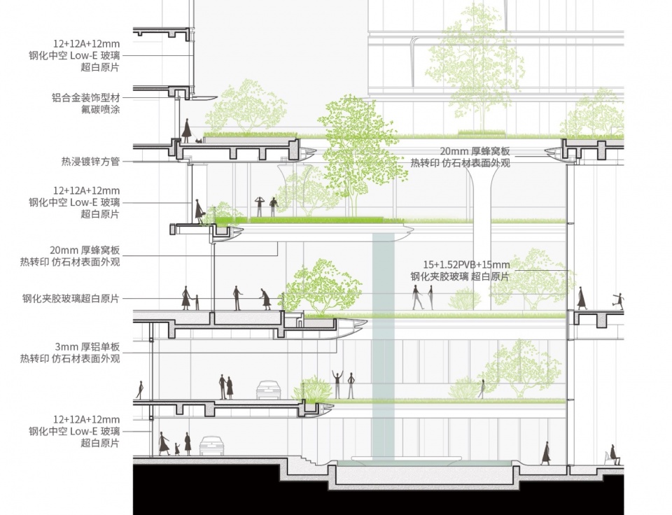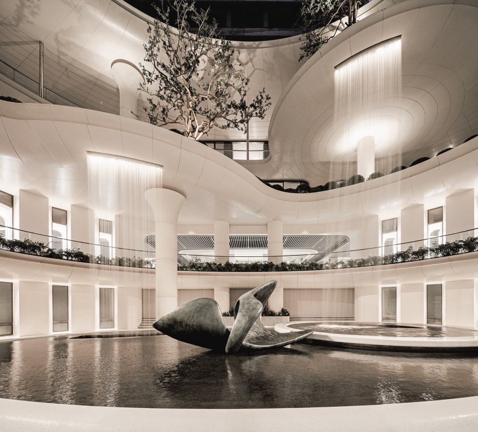 中庭空间以多层瀑布景观和垂直绿植为视觉核心,同时结合艺术展陈、城市休闲、景观打卡等功能,打造包容性的公共活动空间。