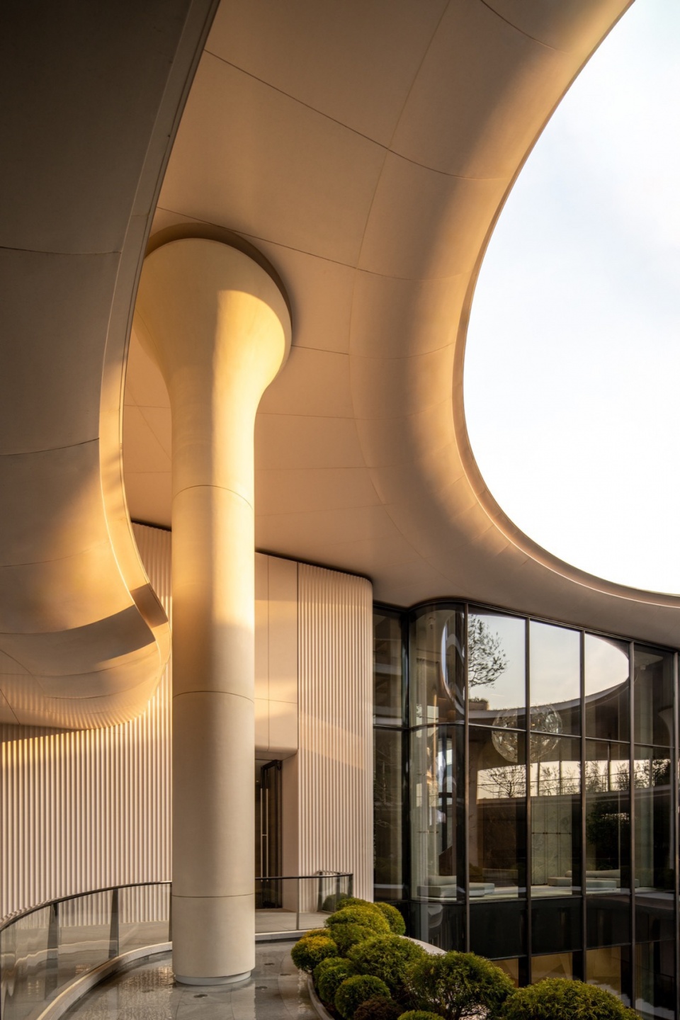 艺术中心主入口,由8根白色UHPC树形立柱阵列支撑,形成10.5米挑高的视觉引导与标志性空间。